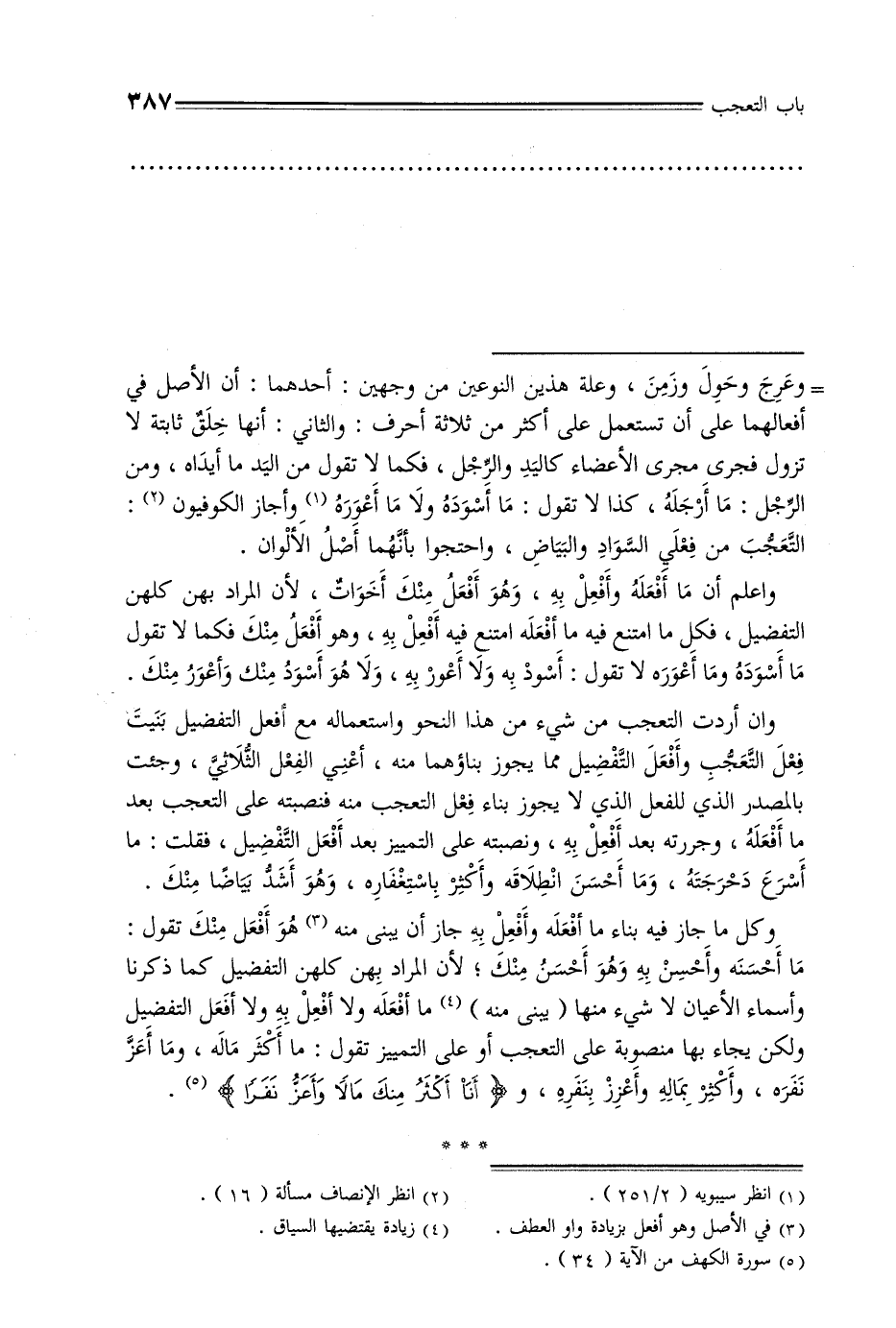 وإن أردت التعجب من شيء من هذا النحو واستعماله مع أفعل التفضيل بنيت فعل التعجب وأفعل التفضيل مما يجوز بناؤهما منه, أعني الفعل الثلاثي, وجئت بالمصدر الذي للفعل الذي لا يجوز بناء فعل التعجب منه فنصبته على التعجب بعد ما أفعله, وجررته بعد أفعل به, ونصبته على التمييز بعد أفعل التفضيل, فقلت: ما أسرع دحرجته, وما أحسن انطلاقه وأكثر باستغفاره, وهو أشد بياضًا منك. وكل ما جاء فيه بناء ما أفعله وأفعل به جاز أن يبنى منه هو أفعل منك تقول: ما أحسنه وأحسن به وهو أحسن منكو لأن المراد بهن كلهن التفضيل كما ذكرنا وأسماء الأعيان لا شيء منها (يبنى منه) ما أفعله ولا أفعل به ولا أفعل التفضيل ولكن يجاء بها منصوبة على التعجب أو على التمييز تقول: ما أكثر ماله, وما أعز نفره, وأكثر بماله وأعزز بنفره, و {أنا أكثر منك مالًا وأعز نفرًا}.