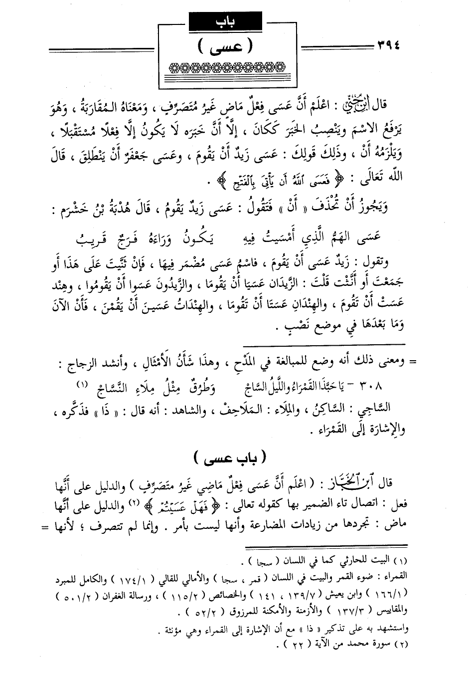 قال ابن جني: اعلم أن عسى فعل ماض غير متصرف, ومعناه المقاربة, وهو يرفع الاسم وينصب الخبر ككان, إلا أنخبره لا يكون إلا فعلًا مستقبلًا, ويلزمه أن, وذلك قولك: عسى زيد أن يقوم, وعسى جعفر أن ينطلق, قال الله تعالى: {فعسى الله أن يأتي بالفتح}.