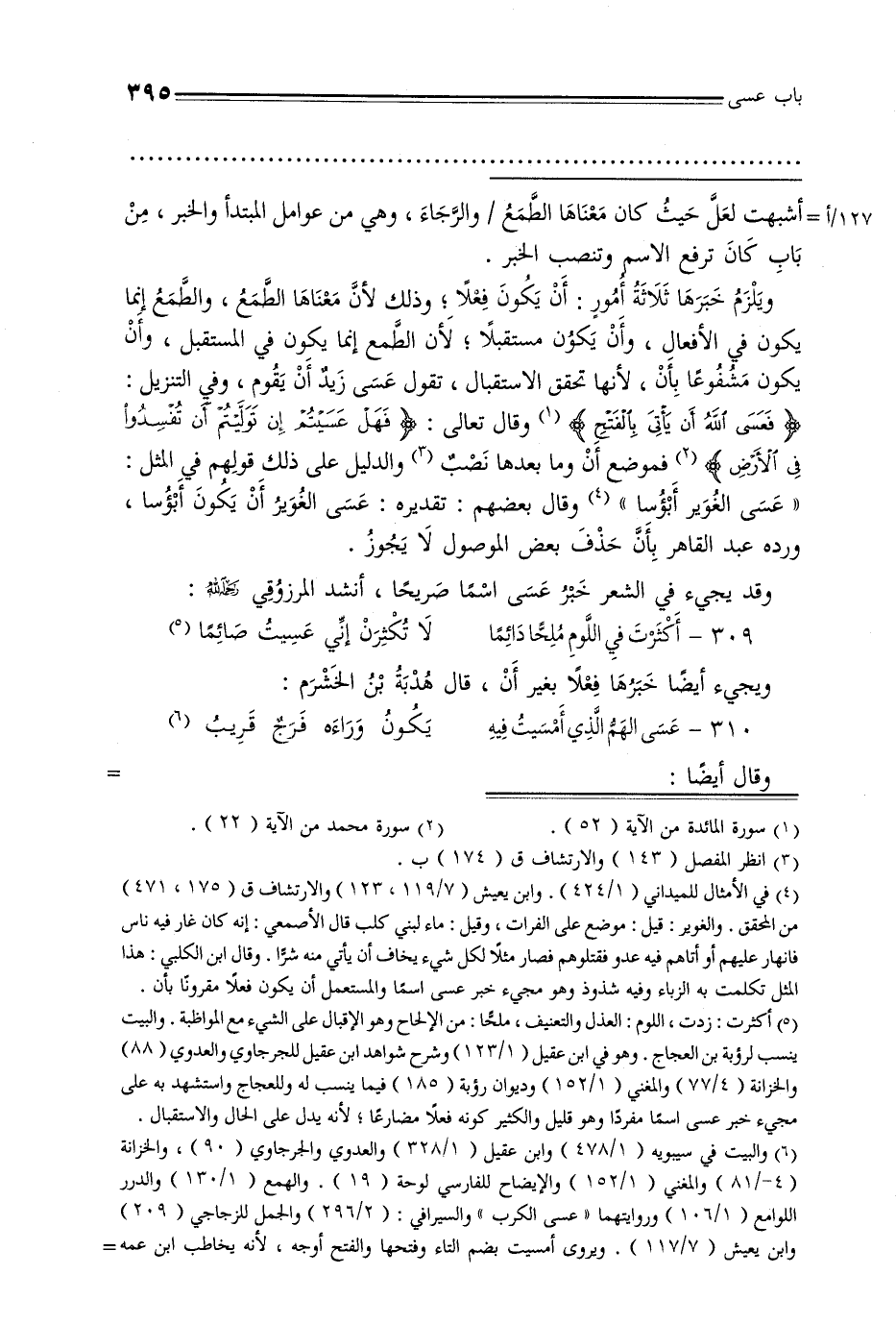 ويلزم خبرها ثلاثة أمور: أن يكون فعلًا, وذلك لأن معناها الطمع, والطمع إنما يكون في الأفعال, وأن يكون مستقبلًا, لأن الطمع إنما يكون في المستقبل, وأن يكون مشفوعًا بأن, لأنها تحقق الاستقبال, تقول عسى زيد أن يقوم, وفي التنزيل: {فعسى الله أن يأتي بالفتح} وقال تعالى: {فهل عسيتم أن توليتم أن تفسدوا في الأرض} فموضع أن وما بعدها نصب والدليل على ذلك قولهم في المثل: «عسى الغوير أبؤسا» وقال بعضهم: تقديره: عسى الغوير أن يكون أبوسا, ورده عبد القاهر بأن حذف بعض الموصول لا يجوز.