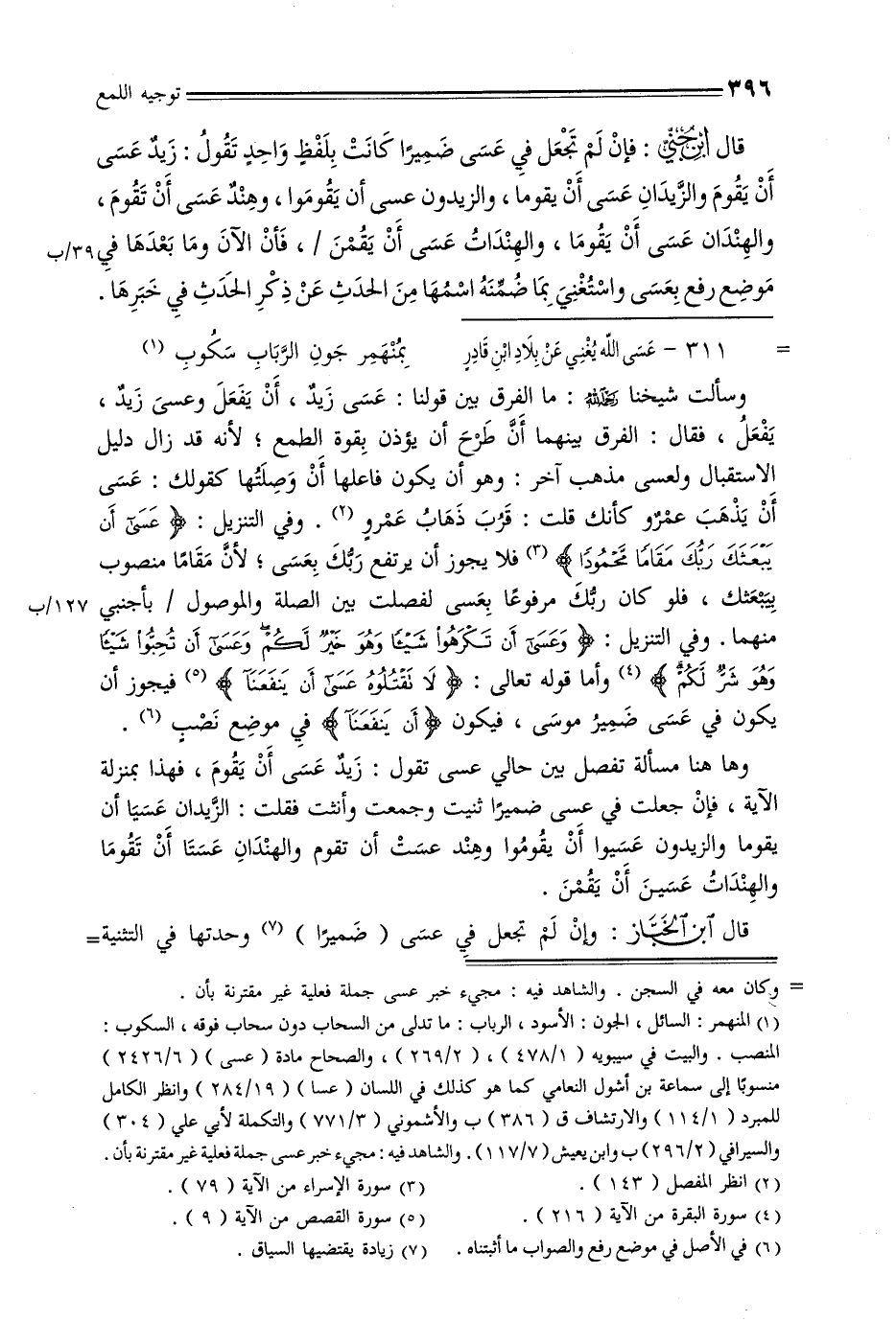 وسألت شيخنا رحمه الله: ما الفرق بين قولنا: عسى زيد, أن يفعل وعسى زيد, يفعل, فقال: الفرق بينهما أن طرح أن يؤذن بقوة الطمع, لأنه قد زال دليل الاستقبال ولعسى مذهب آخر: وهو أن يكون فاعلها أن وصلتها كقولك: عسى أن يذهب عمرو كأنك قلت: قرب ذهاب عمرو. وفي التنزيل: {عسى أن يبعثك ربك مقامًا محمودًا} فلا يجوز أن يرتفع ربك بعسى, لأن مقامًا منصوب يببعثك, فلو كان ربك مرفوعًا بعسى لفصلت بين الصلة والموصول / بأجنبي 127/ب منهما. وفي التنزيل: {وعسى أن تكرهوا شيئًا وهو خير لكم وعسى أن تحبوا شيئًا وهو شر لكم} وأما قوله تعالى: {لا تقتلوه عسى أن ينفعنا} فيجوز أن يكون في عسى ضمير موسى, فيكون {أن ينفعنا} في موضع نصب. وها هنا مسألة تفصل بين حالي عسى تقول: زيد عسى أن يقوم, فهذا بمنزلة الآية, فإن جعلت في عسى ضميرًا ثنيت وجمعت وأنثت فقلت: الزيدان عسيا أن يقوما والزيدون عسيوا أن يقوموا وهند عست أن تقوم والهندان عستا أن تقوما والهندات عسين أن يقمن.