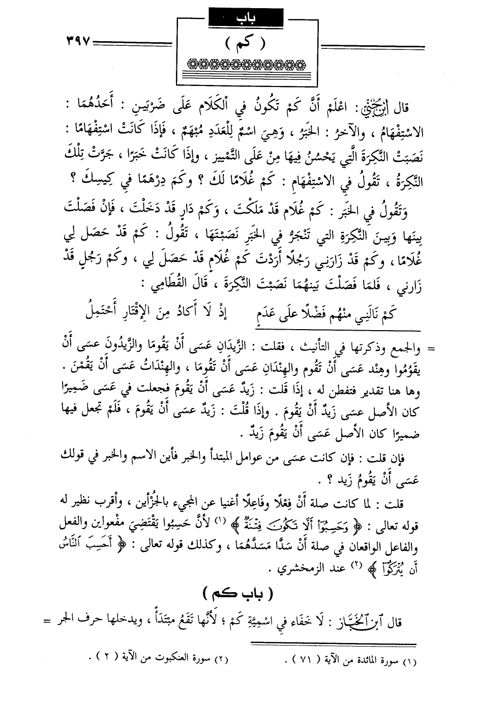 قال ابن جني: اعلم أن كم تكون في الكلام على ضربين: أحدهما: الاستفهام, والآخر: الخبر, وهي اسم للعدد مبهم, فإذا كانت استفهامًا: نصبت النكرة التي يحسن فيها من على التمييز, وإذا كانت خبرًا, جرت تلك النكرة, تقول في الاستفهام: كم غلامًا لك؟ وكم درهمًا في كيسك؟ وتقول في الخبر: كم غلام قد ملكت, وكم دار قد دخلت, فإن فصلت بينها وبين النكرة التي تنجر في الخبر نصبتها, تقول: كم قد حصل لي غلامًا, وكم قد زادني رجلًا أردت كم غلام قد حصل لي, وكم رجل قد زارني, فلما فصلت بينهما نصبت النكرة, قال القطامي: