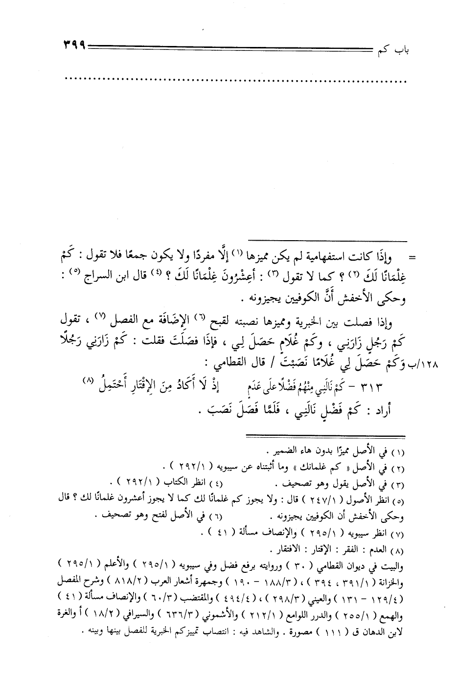 وإذا فصلت بين الخبرية ومميزها نصبته لقبح الإضافة مع الفصل, تقول كم رجل زارني, وكم غلام حصل لي, فإذا فصلت فقلت: كم زارني رجلًا 128/ب وكم حصل لي غلامًا نصبت / قال القطامي: