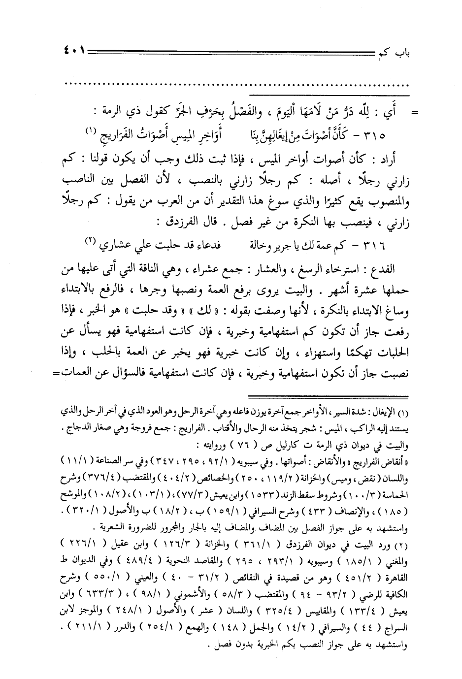 الفدع: استرخاء الرسغ, والعشار: جمع عشراء, وهي الناقة التي أتى عليها من حملها عشرة أشهر. والبيت يروى برفع العمة ونصبها وجرها, فالرفع بالابتدء وساغ الابتداء بالنكرة, لأنها وصفت بقوله: «لك» «وقد حلبت» هو الخبر, فإذا رفعت جاز أن تكون كم استفهامية وخبرية, فإن كانت استفهامية فهو يسأل عن الحلبات تهكمًا واستهزاء, وإن كانت خبرية فهو يخبر عن العمة بالحلب, وإذا نصبت جاز أن تكون استفهامية وخبرية, فإن كانت استفهامية فالسؤال عن العمات