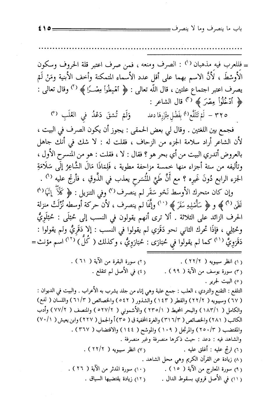 فجمع بين اللغتين. وقال لي بعض الحمقى: يجوز أن يكون الصرف في البيت, لأن الشاعر أراد سلامة الجزء من الزحاف, فقلت له: لا شك في أنك جاهل بالعروض أتدري البيت من أي بحر هو؟ فقال: لا, فقلت: هو من المنسرح الأول, وتأليفه من ستة أجزاء منها خمسة مزاحفة مطوية, فلماذا مال الشاعر إلى سلامة الجزء الرابع دون غيره؟ مع أن طي المنسرح يعذب في الذوق, فأرتج عليه. وإن كان متحرك الأوسط نحو سقر لم ينصرف وفي التنزيل: {كلا إنها لظى} و {سأصليه سقر} وإنما لم ينصرف, لأن حركة أوسطه نزلت منزلة الحرف الزائد على الثلاثة. ألا ترى أنهم يقولون في النسب إلى حبلى: حبلوي وحبلي, فإذا تحرك الثاني نحو دقري لم يقولوا في النسب: إلا دقري ولم يقولوا: دقروي كما لم يقولوا في حبارى: حباروي, وكذلك (كل) اسم مؤنث