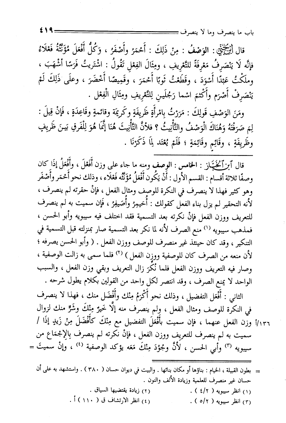 قال ابن الخباز: الخامس: الوصف ومنه ما جاء على وزن أفعل, وأفعل إذا كان وصفًا ثلاثة أقسام: القسم الأول: أن يكون أفعل مؤنثه فعلاء, وذلك نحو أحمر وأصفر وهو كثير فهذا لا ينصرف في النكرة للوصف ومثال الفعل, فإن حقرته لم ينصرف, لأنه التحقير لم يزل بناء الفعل كقولك: أحيمر وأصيفر, فإن سميت به لم ينصرف للتعريف ووزن الفعل فإن نكرته بعد التسمية فقد اختلف فيه سيبويه وأبو الحسن, فمذهب سيبويه منع الصرف لأنه لما نكر بعد التسمية صار بمنزلته قبل التسمية في التنكير, وقد كان حينئذ غير منصرف للوصف ووزن الفعل. (وأبو الحسن يصرفه, لأن منعه من الصرف كان للوصفية ووزن الفعل) فلما سمي به زالت الوصفية, وصار فيه التعريف ووزن الفعل فلما نكر زال التعريف وبقي وزن الفعل, والسبب الواحد لا يمنع الصرف, وقد انتصر لكل واحد من القولين بكلام يطول شرحه.