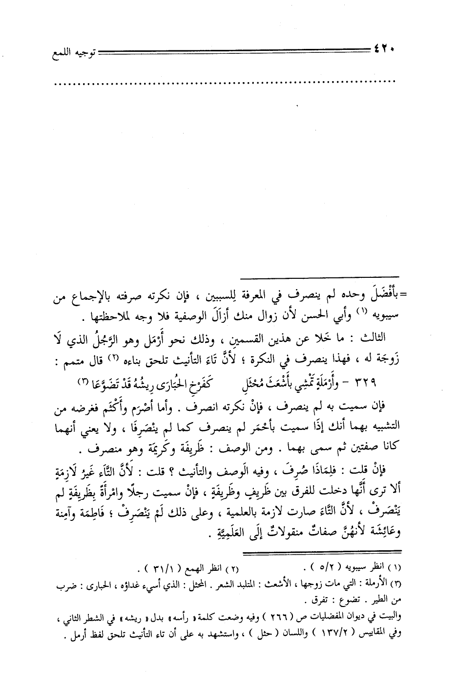 الثالث: ما خلا عن هذين القسمين, وذلك نحو أرمل وهو الرجل الذي لا زوجه له, فهذا ينصرف في النكرة, لأن تاء التأنيث تلحق بناءه قال متمم: