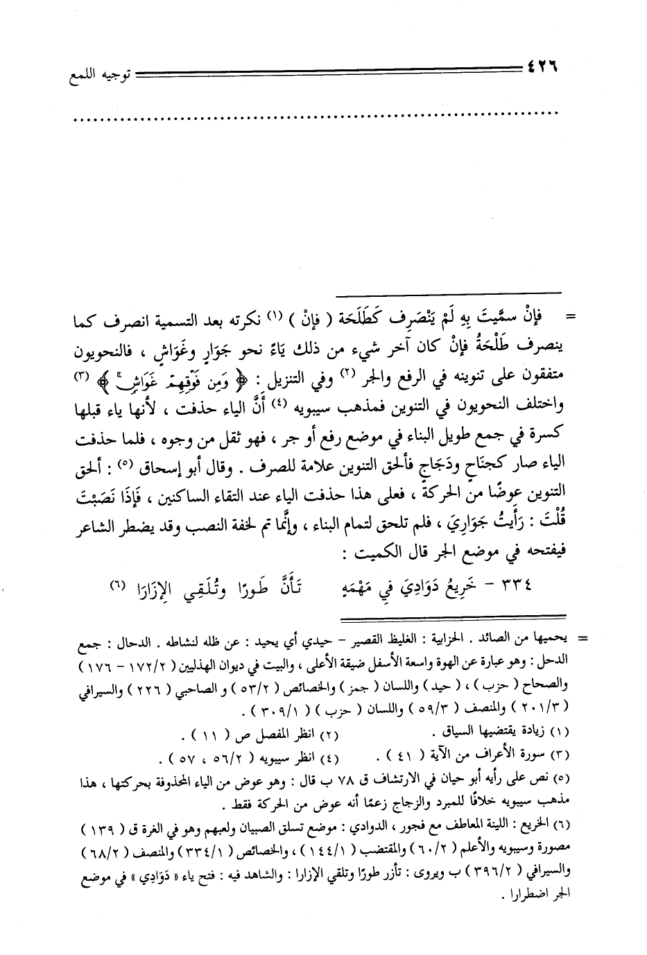 = فإن سميت به لم ينصرف كطحلة (فإن) نكرته بعد التسمية انصرف كما ينصرف طلحة فإن كان آخر شيء من ذلك ياء نحو جوار وغواش, فالنحويون متفقون على تنوينه في الرفع والجر وفي التنزيل: {ومن فوقهم غواش} واختلف النحويون في التنوين فمذهب سيبويه أن الياء حذفت, لأنها ياء قبلها كسرة في جمع طويل البناء في موضع رفع أو جر, فهو ثقل من وجوه, فلما حذفت الياء صار كجناح ودجاج فألحق التنوين علامة للصرف. وقال أبو إسحاق: ألحق التنوين عوضًا من الحركة, فعلى هذا حذفت الياء عند التقاء الساكنين, فإذا نصبت قلت: رأيت جواري, فلم تلحق لتمام البناء, وإنما تم لخفة النصب وقد يضطر الشاعر فيفتحه في موضع الجر قال الكميت: