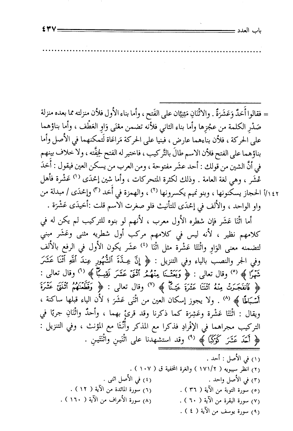 = فقالوا أحد وعشرة. والاثنان مبنيان على الفتح, وأما بناء الأول فلأن منزلته مما بعده منزلة صدر الكلمة من عجزها وأما بناء الثاني فلأنه تضمن معنى واو العطف, وأما بناؤهما على الحركة, فلأن بناءهما عارض, فبنيا على الحركة مراعاة لتمكنهما في الأصل وأما بناؤهما على الفتح فلأن الاسم طال بالتركيب, فاختير له الفتح لخفته, ولا خلاف بينهم في أن الشين من قولك: أحد عشر مفتوحة, ومن العرب من يسكن العين فيقول: أحد عشر, وهي لغة العامة. وذلك لكثرة المتحركات, وأما شين إحدى عشرة فأهل 142/أالحجاز يسكنونها, وبنو نميم يكسرونها, والهمزة في أحد وإحدى / مبدلة من واو الواحد, والألف في إحدى للتأنيث فلو صغرت الاسم قلت: أحيدى عشرة. أما اثنا عشر فإن شطره الأول معرب, لأنهم لو بنوه للتركيب لم يكن له في كلامهم نظير, لأنه ليس في كلامهم مركب أول شطريه مثنى وعشر مبني لتضمنه معنى الواو واثنتا عشرة مثل اثنا عشر يكون الأول في الرفع بالألف وفي الجر والنصب بالياء وفي التنزيل: {إن عدة الشهور عند الله اثنا عشرة شهرا} وقال تعالى: {وبعثنا منهم اثنى عشر نقيبًا} وقال تعالى: {فانفجرت منه اثنتا عشرة عينًا} وقال تعالى: {وقطعناهم اثنتى عشرة أسباطًا}. ولا يجوز إسكان العين من اثنى عشر, لأن الياء قبلها ساكنة, ويقال: اثنتا عشرة وعشرة كما ذكرنا وقد قرئ بهما, وأحد واثنان جريًا في التركيب مجراهما في الإفراد فذكرا مع المذكر وأنثا مع المؤنث, وفي التنزيل: {أحد عشر كوكبًا} وقد استشهدنا على اثنين واثنتين.
