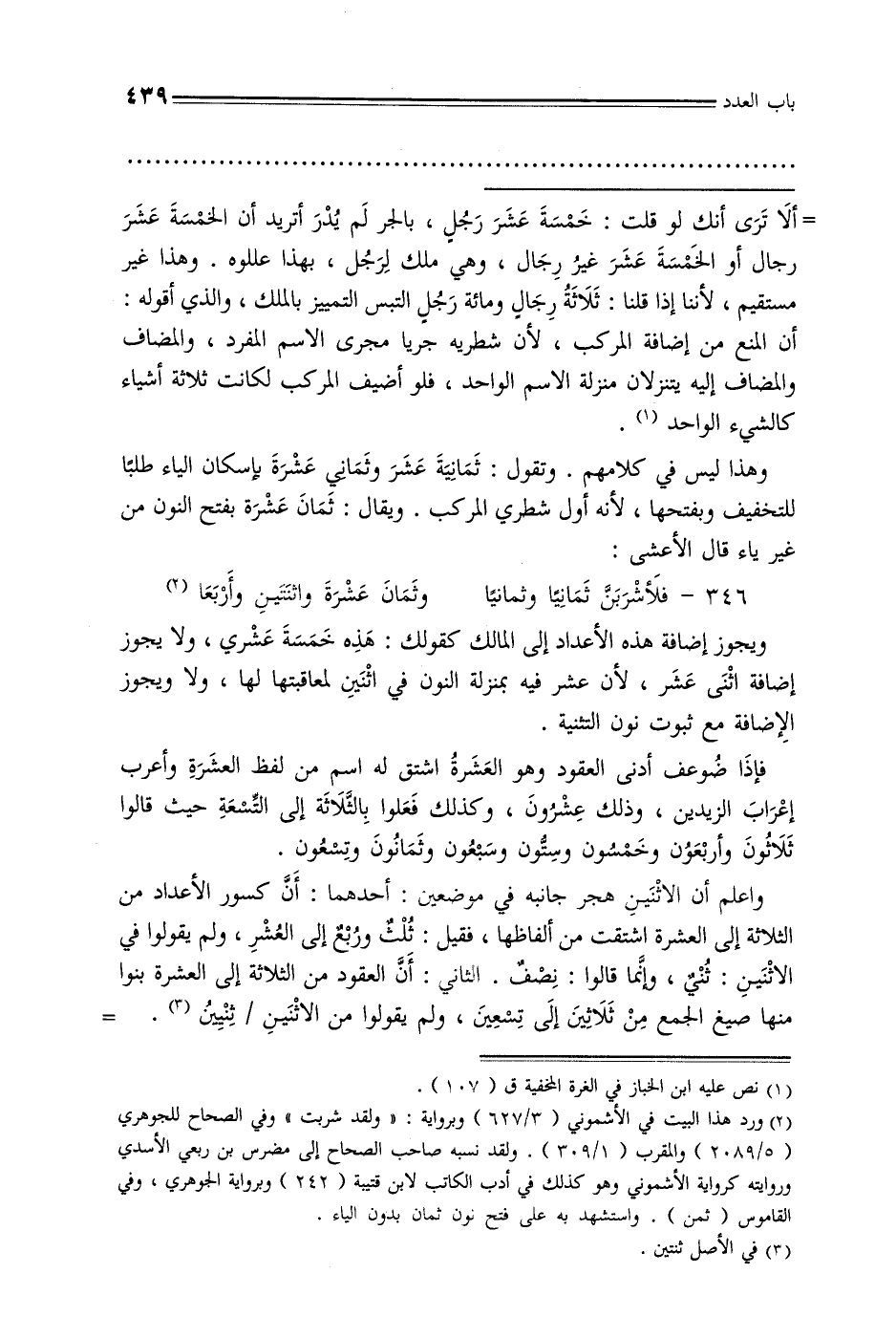 = ألا ترى أنك لو قلت: خمسة عشر رجل, بالجر لم يدر أتريد أن الخمسة عشر رجال أو الخمسة عشر غير رجال, وهي ملك لرجل, بهذا عللوه. وهذا غير مستقيم, لأننا إذا قلنا: ثلاثة رجال ومائة رجل التبس التمييز بالملك, والذي أقوله: أن المنع من إضافة المركب, لأن شطريه جريا مجرى الاسم المفرد, والمضاف والمضاف إليه يتنزلان منزلة الاسم الواحد, فلو أضيف المركب لكانت ثلاثة أشياء كالشيء الواحد.