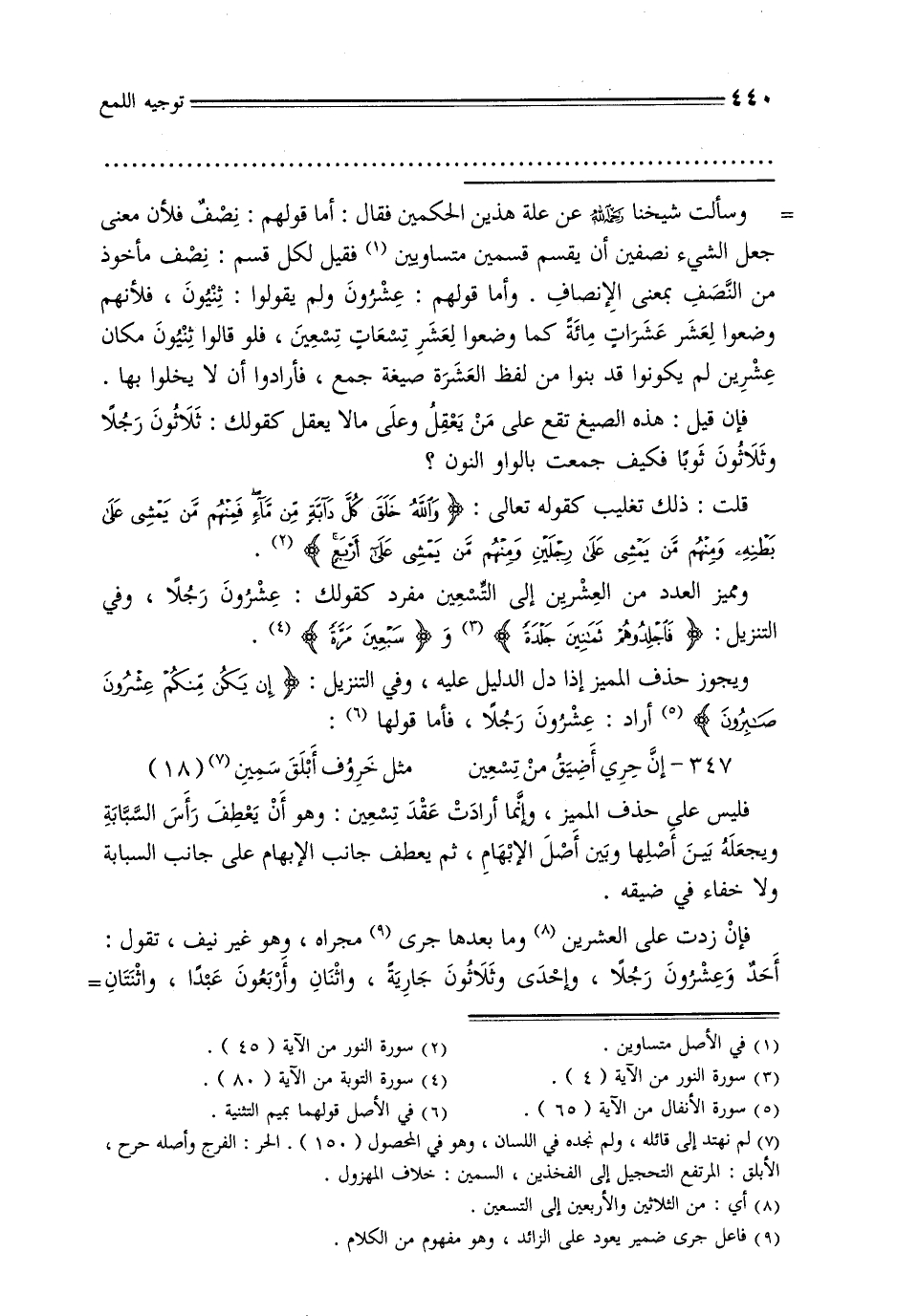 = وسألت شيخنا رحمه الله عن علة هذين الحكمين فقال: أما قولهم: نصف فلأن معنى جعل الشيء نصفين أن يقسم قسمين متساويين فقيل لكل قسم: نصف مأخوذ من النصف بمعنى الإنصاف. وأما قولهم: عشرون ولم يقولوا: ثنيون, فلأنهم وضعوا لعشر عشرات مائة كما وضعوا لعشر تسعات تسعين, فلو قالوا ثنيون مكان عشرين لم يكونوا قد بنوا من لفظ العشرة صيغة جمع, فأرادوا أن لا يخلوا بها. فأن قيل: هذه الصيغ تقع على من يعقل وعلى مالا يعقل كقولك: ثلاثون رجلا وثلاثون ثوبًا فكيف جمعت بالواو والنون؟