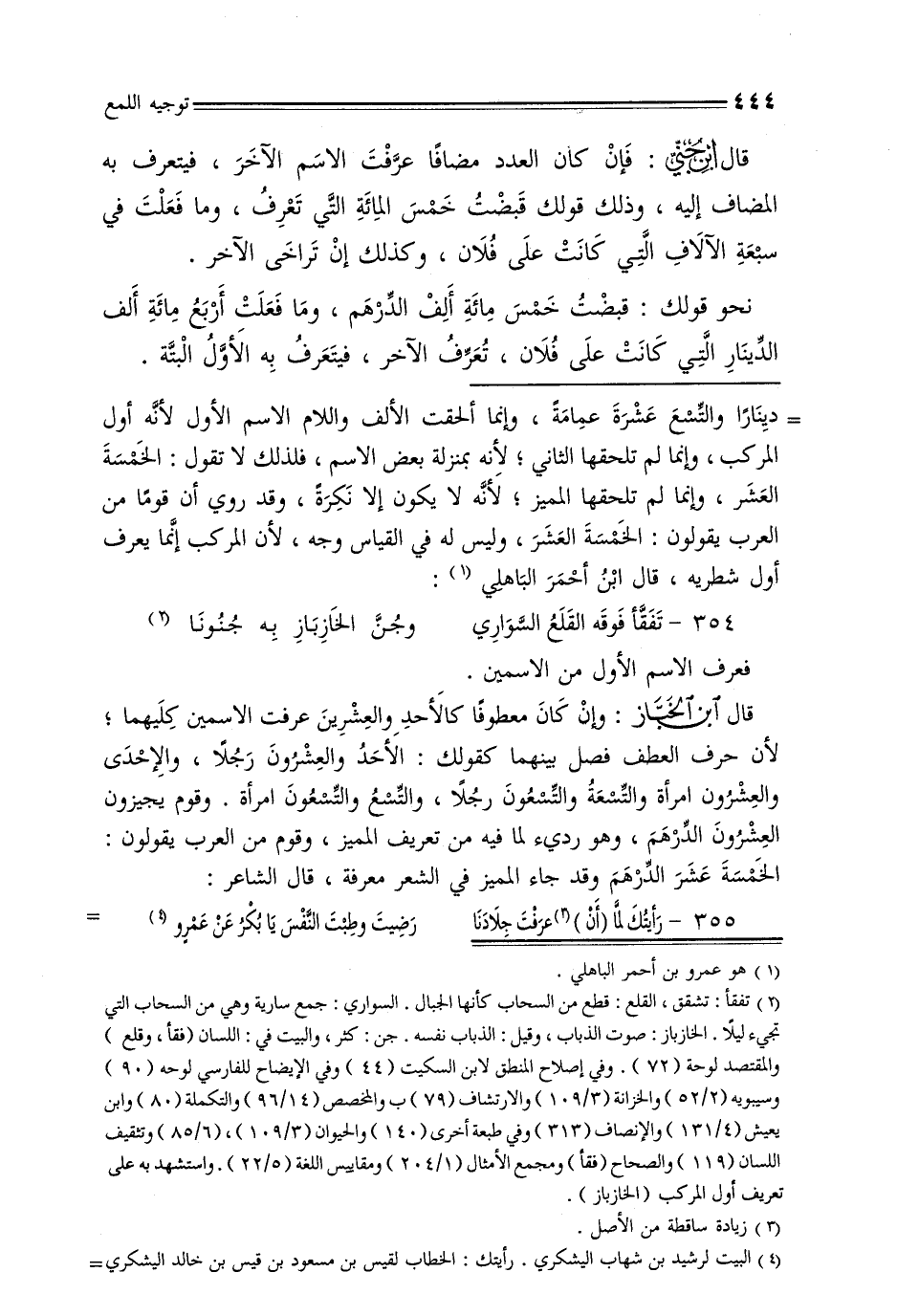 دينارًا والتسع عشرة عمامة, وإنما ألحقت الألف واللام الاسم الأول لأنه أول المركب, وإنما لم تلحقها الثاني, لأنه بمنزلة بعض الاسم, فلذلك لا تقول: الخمسة العشر, وإنما لم تلحقها المميز, لأنه لا يكون إلا نكرة, وقد روي أن قومًا من العرب يقولون: الخمسة العشر, وليس له في القياس وجه, لأن المركب إنما يعرف أو شطريه, قال ابن أحمر الباهلي: