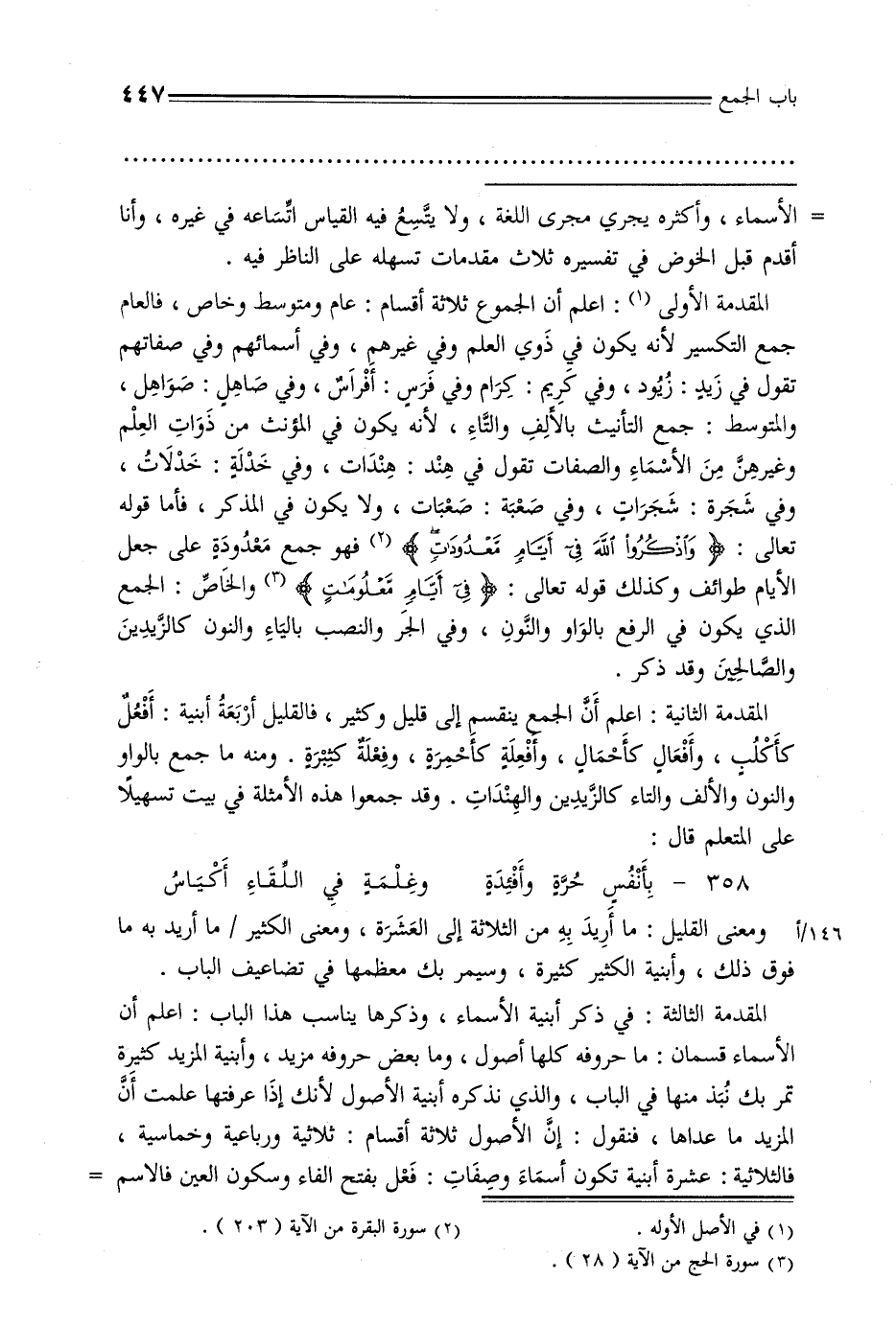 المقدمة الثانية: اعلم أن الجمع ينقسم إلى قليل وكثير, فالقليل أربعة أبنية: أفعل كأكلب, وأفعال كأحمال, وأفعلة كأحمرة, وفعلة كثيرة. ومنه ما جمع بالواو والنون والألف والتاء كالزيدين والهندات. وقد جمعوا هذه الأمثلة في بيت تسهيلًا على المتعلم قال: