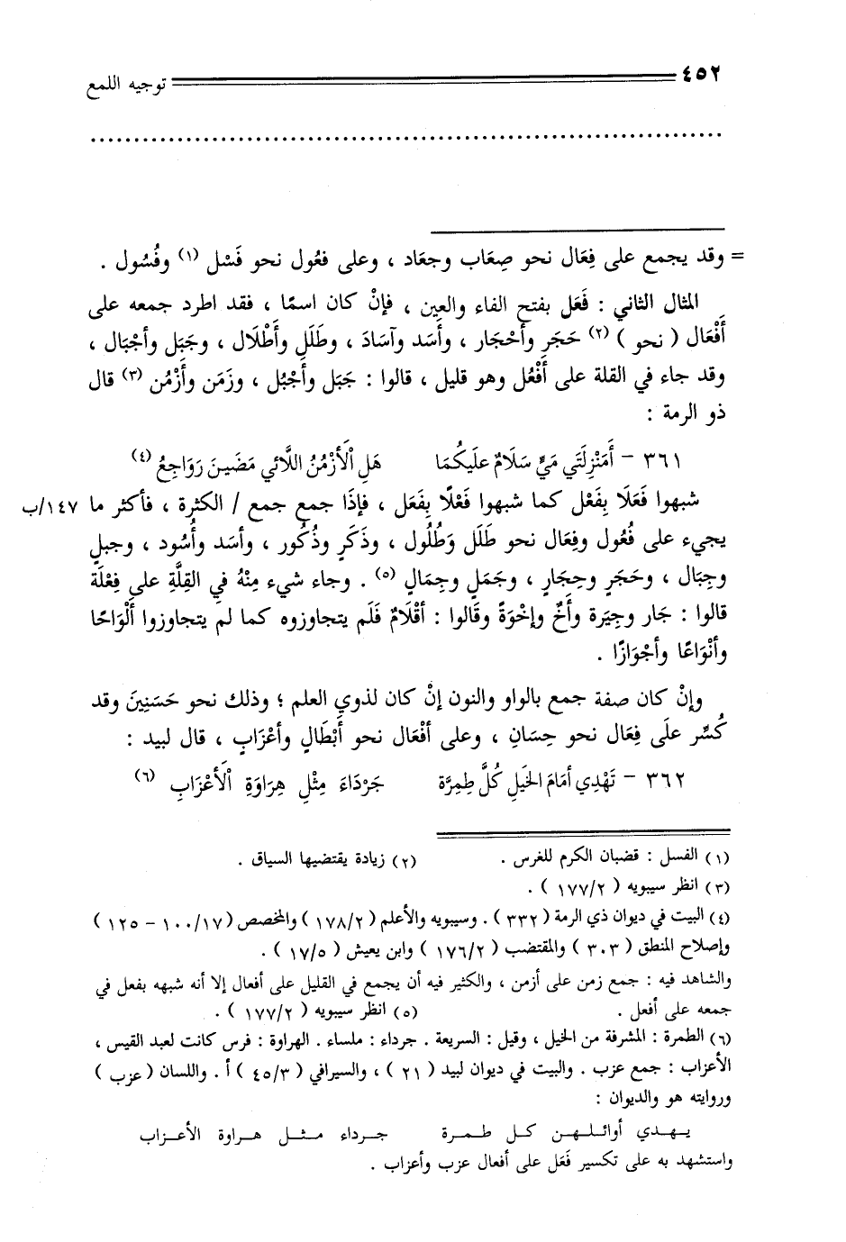 شبهوا فعلا بفعل كما شبهوا فعلًا بفعل, فإذا جمع جمع / الكثرة, فأكثر ما 147/ ب يجيء على فعول وفعال نحو طلل وطلول, وذكر وذكور, وأسد وأسود, وجبل وجبال, وحجر وحجار, وجمل وجمال. وجاء شيء منه في القلة على فعلة قالوا: جار وجيرة وأخ وإخوة وقالوا: أقلام فلم يتجاوزوه كما لم يتجاوزوا ألواحًا وأنواعًا وأجوازًا.