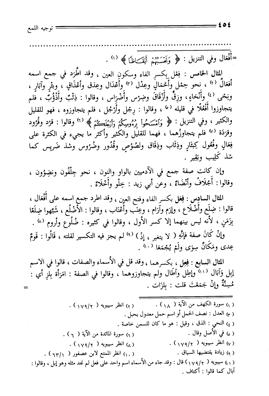 المثال السادس: فعل بكسر الفاء وفتح العين, وقد اطرد جمع اسمه على أفعال, قالوا: ضع وأضلاع, وإزم وآرام, وعنب وأعناب, وقالوا: الأضلع, شبهوا ضلعًا بزمن, لأنه ليس بينهما إلا كسر الأول, وقالوا في كثيره: َلوع وأروم. وإن كان صفة فإنه (لا يتغير, إذ) لم يجز فيه التكسير لقلته, قالوا: قوم عدى ومكان سوى ولم يجمعا.