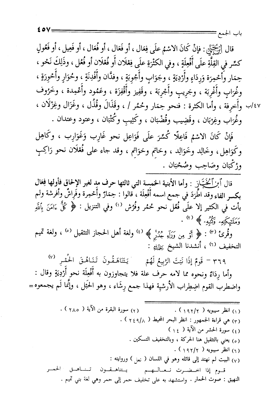 قال ابن جني: فإن كان الاسم على فعال, أو فعال, أو فعال, أوفعيل, أو فعول كسر في القلة على أفعله, وفي الكثرة على فعلان أو فعلان أو فعل, وذلك نحو, حمار وأحمرة ورداء وأردية, وجواب وأجوبة, وفدان وأفدنة, وحوار وأحورة, وغراب وأغربة, وجريب وأجربة, وقفيز وأقفزة, وعمود وأعمدة, وخروف 47/ب وأخرفة, وأما الكثرة: فنحو حمار وحمر /, وقذال وقذل, وغزال وغزلان, وغراب وغربان, وقضيب وقضبان, وكثيب وكثبان, وعتود وعتدان. فإن كان الاسم فاعلًا كسر على فوعل نحو غارب وغوارب, وكاهل وكواهل, وخالد وخولد, وحاتم وحواتم, وقد جاء على فلان نحو راكب وركبان وصاحب وصحبان.