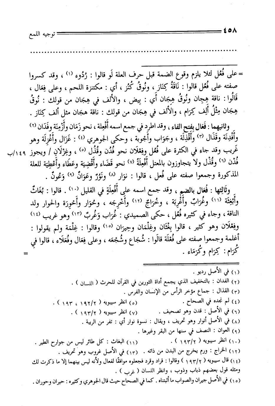 وثالثهما: فعال بالضم, وقد جمع اسمه على أفعلة في القليل. قالوا: بغاث وأبغثة وغراب وأغربة, وخراج وأخرجه, وحوار وأحورة والحوار ولد الناقة, وجاء في كثيره فعل, حكى الصميدي: غراب وغرب وهو غريب وفعلان وهو كثير, قالوا بغثان وغلمان وحيران وقالوا: غلمة ولم يقولوا: أغلمة وجمعوا صفته على فعلة قالوا: شجاع وشجعه, وعلى فعال وفعلاء, قالوا في كرام: كرام وكرماء.