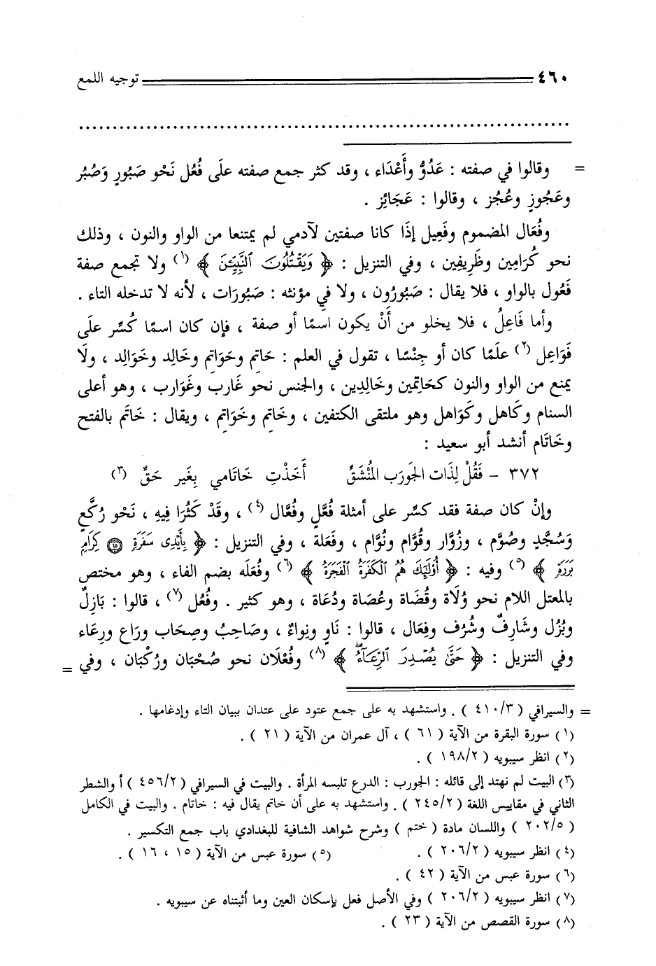 = وقالوا في صفته: عدو وأعداء, وقد كثر جمع صفته على فعل نحو صبور وصبر وعجوز وعجز, وقالوا: عجائز.