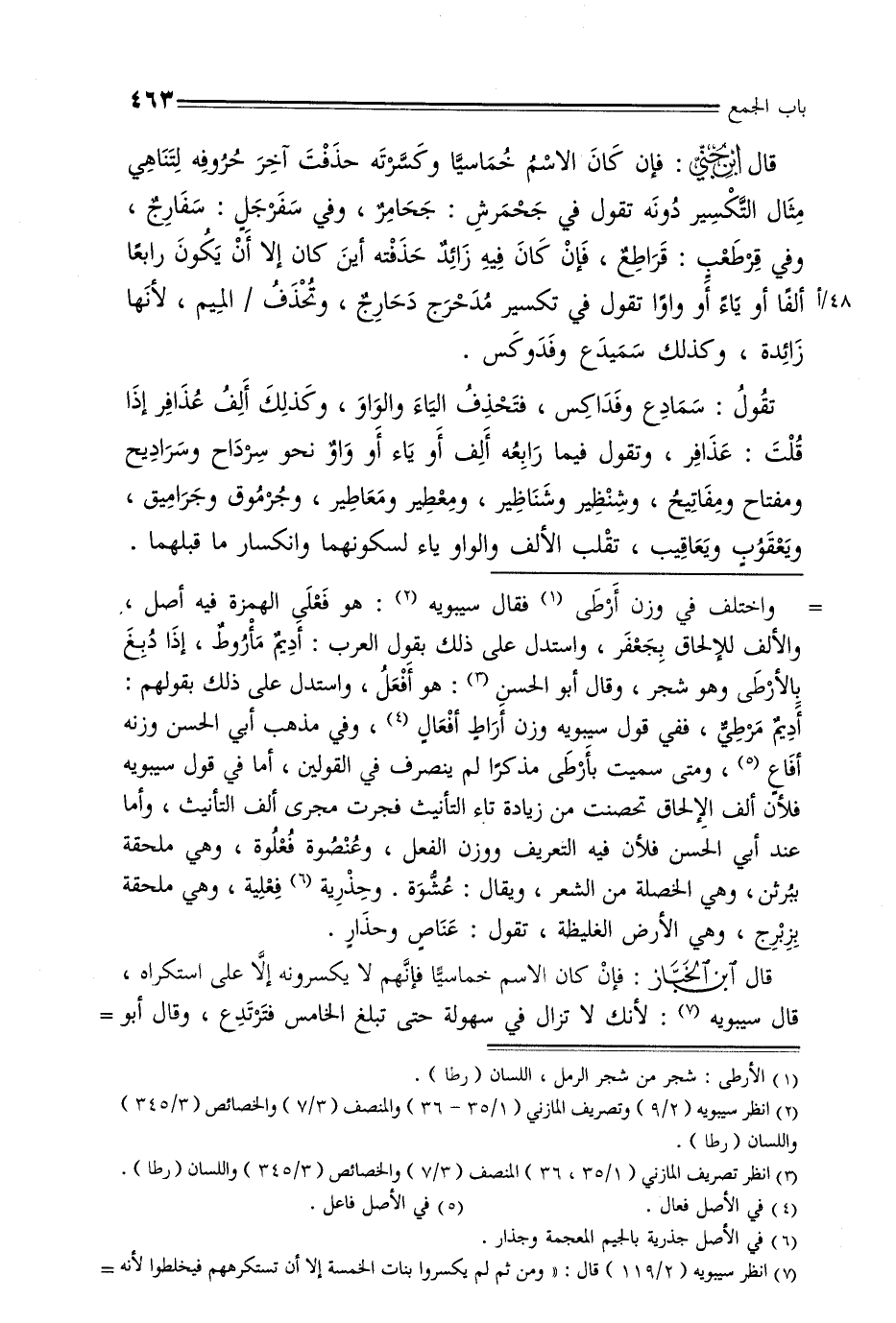 قال ابن جني: فإن ك ان الاسم خماسيًا وكسرته حذفت آخر حروفه لتناهي مثال التكسير دونه تقول في جحمرش: جحامر, وفي سفرجل: سفارج, وفي قرطعب: قراطع, فإن كان فيه زائد حذفته أين كان إلا أن يكون رابعًا 48/أألفًا أو ياءً أو واوًا تقول في تكسير مدحرج دحارج, وتحذف / الميم, لأنها زائدة, وكذلك سميدع وفدوكس.