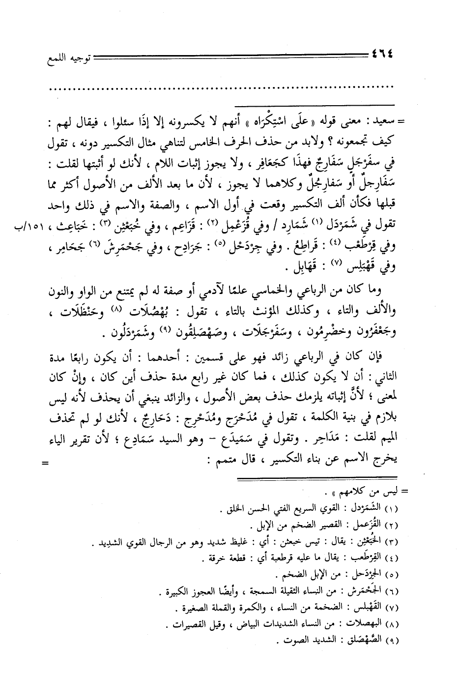 = سعيد: معنى قوله «على استكراه» أنهم لا يكسرونه إلا إذا سئلوا, فيقال لهم: كيف تجمعونه؟ ولابد من حذف الحرف الخامس لتناهي مثال التكسير دونه, تقول في سفرجل سفارج فهذا كجعافر, ولا يجوز إثبات اللام, لأنك لو أثبتها لقلت: سفارجل أو سفارجل وكلاهما لا يجوز, لأن ما بعد الألف من الأصول أكثر مما قبلها فكأن ألف التكسير وقعت في أول الاسم, والصفة والاسم في ذلك واحد تقول في شمردل شمارد / وفي قزعمل: قزاعم, وفي خبعثن: خباعث, 151/ب وفي قرطعب: قراطع. وفي جردحل: جرادح, وفي جحمرش جحامر, وفي قهبس: قهابل.