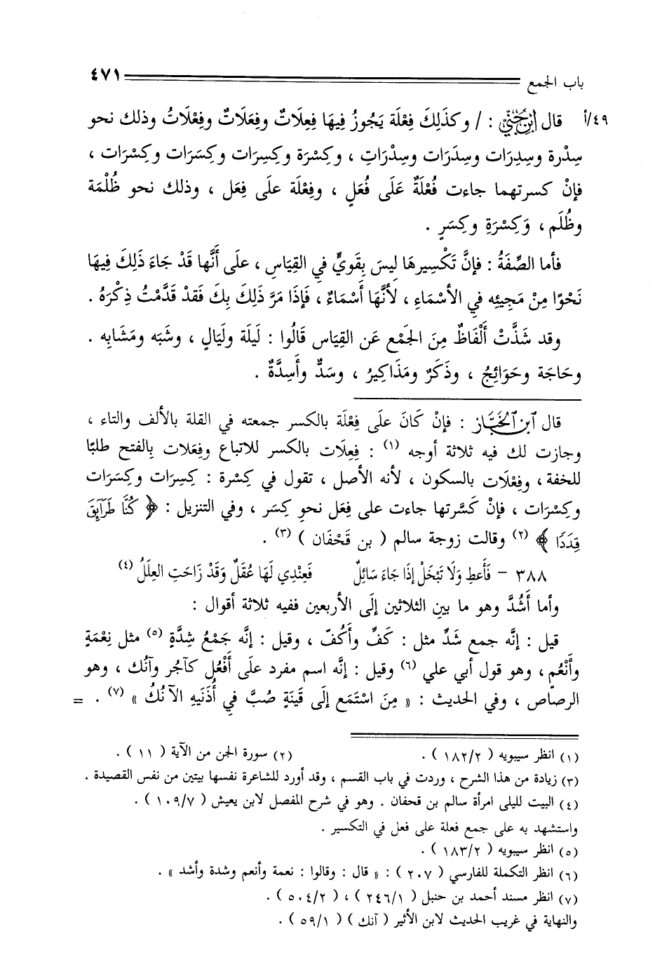 149/أقال ابن جني: / وكذلك فعلة يجوز فيها فعلات وفعلات وفعلات وذلك نحو سدرة وسدرات وسدرات وسدرات, وكسرة وكسرات وكسرات وكسرات, فإن كسرتهما جاءت فعلة على فعل, وفعلة على فعل, وذلك نحو ظلمة وظلم, وكسرة كسر.