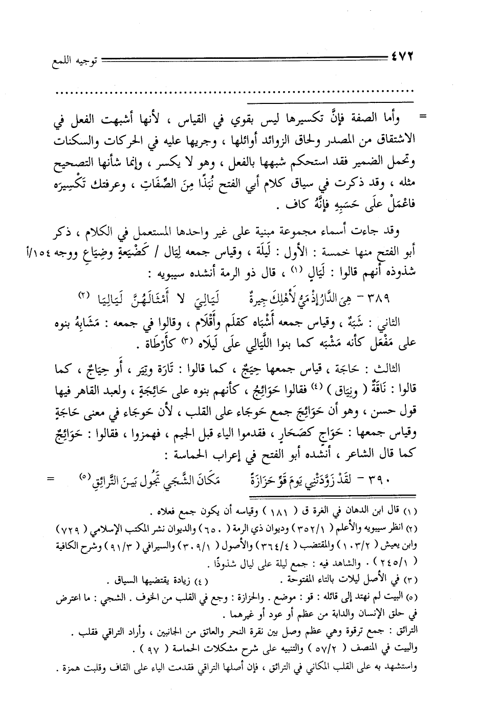 وقد جاءت أسماء مجموعة مبنية على غير واحدها المستعمل في الكلام, ذكر أبو الفتح منها خمسة: الأول: ليلة, وقياس جمعه ليال / كضيعة وضياع ووجه 154/أشذوذه أنهم قالوا: ليال, قال ذو الرمة أنشده سيبويه: