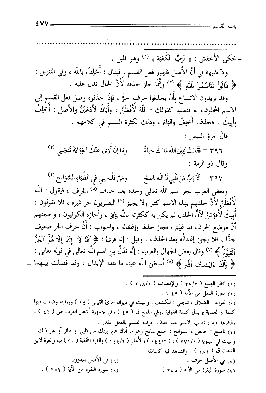 وبعض العرب يجر اسم الله تعالى وحده بعد حذف الحرف, فيقول: الله لأفعلن لأن حلفهم بهذا الاسم كثير ولا يجيز البصريون جر غيره, فلا يقولون: أبيك لأقومن لأن الحلف لم يكن به ككثرته بالله عز وجل, وأجازه الكوفيون, وحجتهم أن موضع الحرف قد علم, فجاز حذفه وإعماله, والجواب: أن حرف الجر ضعيف جدًا, فلا يجوز إعماله بعد الحذف, وقيل: إنه قرئ: {الله لا إله إلا هو الحي القيوم} وقال بعض الجهال بالعربية: إنه بدل من اسم الله تعالى في قوله تعالى: {تلك آيات الله} أسخن الله عينه ما هذا الإبدال, وقد فصلت بينهما =