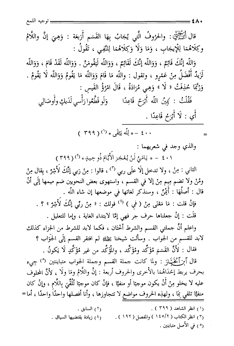 واعلم أن جملتي القسم والشرط أختان, فكما لابد للشرط من الجزاء كذلك لابد للقسم من الجواب. وسألت شيخنا رحمه الله لم افتقر القسم إلى الجواب؟ فقال: لأن القسم مؤكد ومؤكد, والمؤكد من غير مؤكد لا يكون.