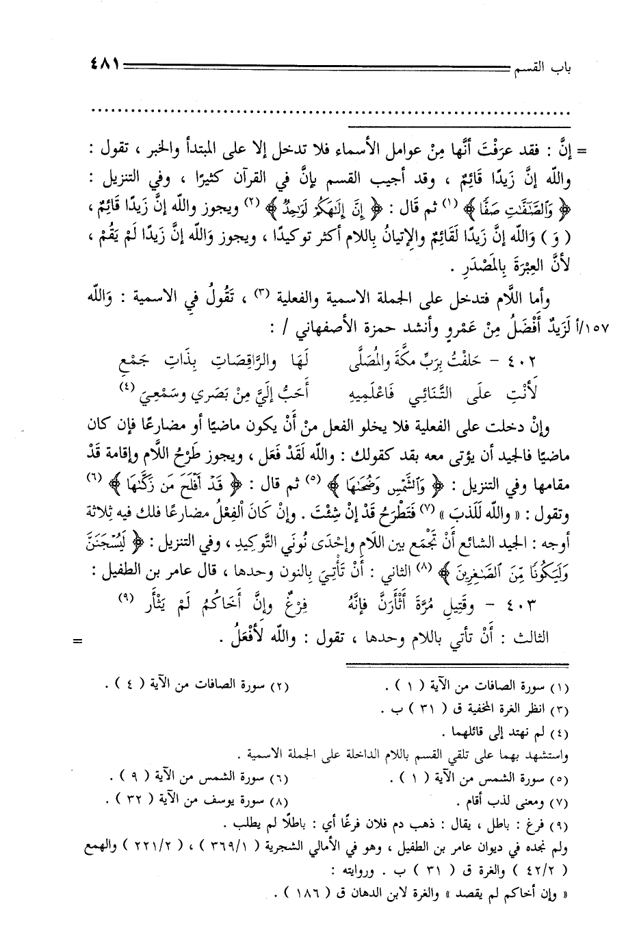 = إن: فقد عرفت أنها من عوامل الأسماء فلا تدخل إلا على المبتدأ والخبر, تقول: والله إن زيدًا قائم, وقد أجيب القسم بإن في القرآن كثيرًا, وفي التنزيل: {والصافات صفا} ثم قال: {إن إلهكم لواحد} ويجوز والله إن زيدًا قائم, (و) والله إن زيدًا لقائم والإتيان باللام أكثر توكيدًا, ويجوز والله إن زيدًا لم يقم, لأن العبرة بالمصدر.