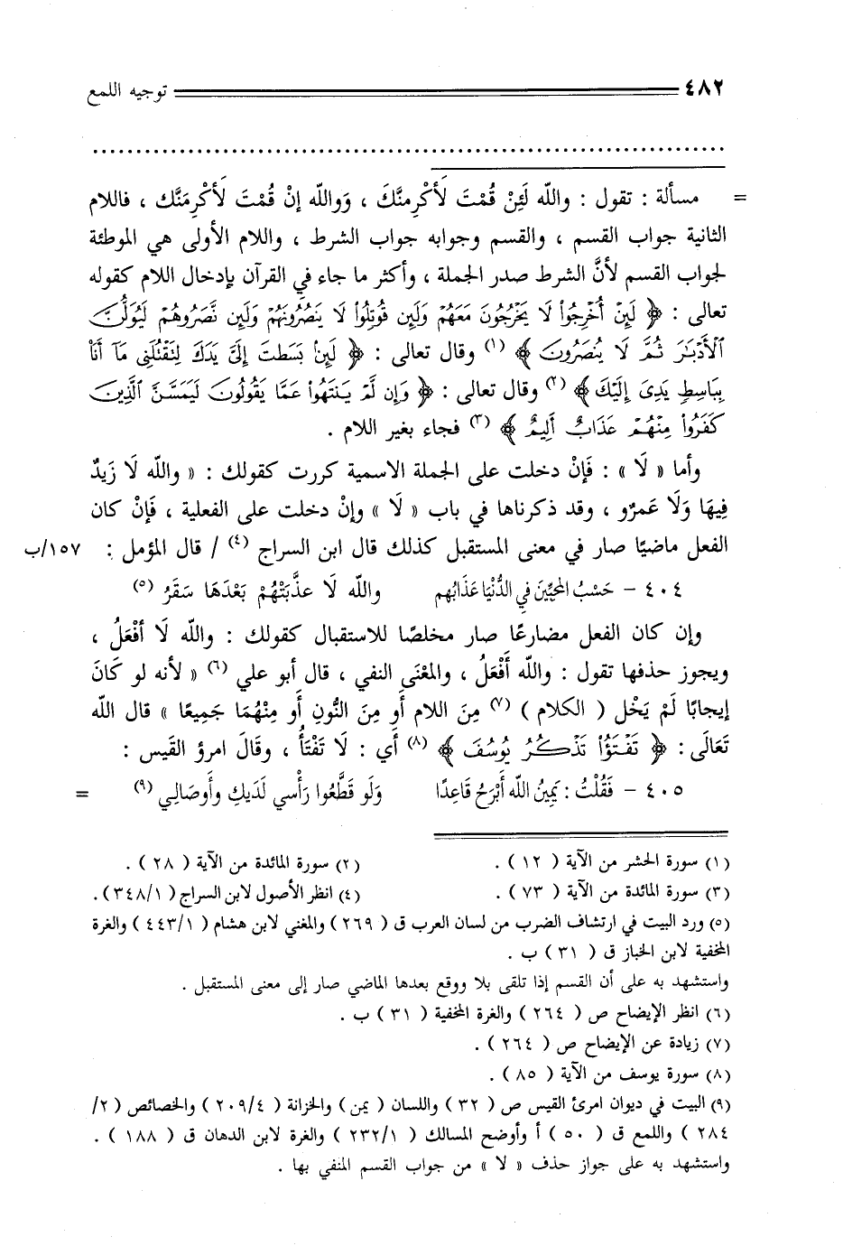 = مسألة: تقول: والله لئن قمت لأكرمنك, ووالله إن قمت لأكرمنك, فاللام الثانية جواب القسم, والقسم جوابه جواب الشرط, واللام الأولى هي الموطئة لجواب القسم لأن الشرط صدر الجملة, وأكثرما جاء في القرآن بإدخال اللام كقوله تعالى: {لئن أخرجوا لا يخرجون معهم ولئن قوتلوا لا ينصرونهم ولئن نصروهم ليولن الأدبار ثم لا ينصرون} وقال تعالى: {لئن بسطت إلي يدك لتقتلني ما أنا بباسط يدي إليك} وقال تعالى: {وإن لم ينتهوا عما يقولون ليمسن الذين كفروا منهم عذاب أليم} فجاء بغير اللام.