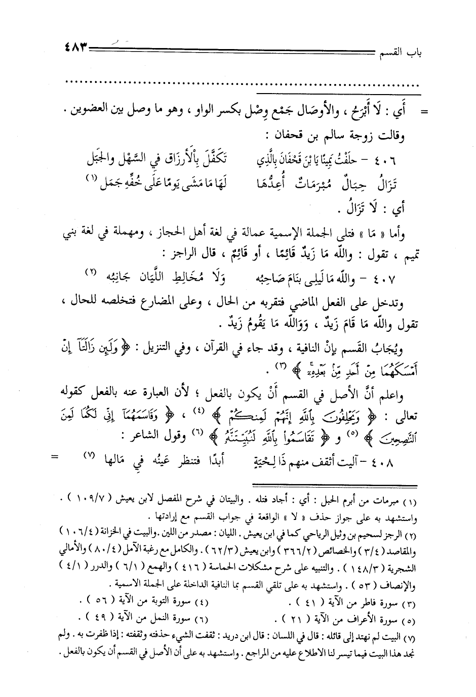 وأما «ما» فتلى الجملة الإسمية عمالة في لغة أهل الحجاز, ومهملة في لغة بني تميم, تقول: والله ما زيد قائمًا, أو قائم, قال الراجز: