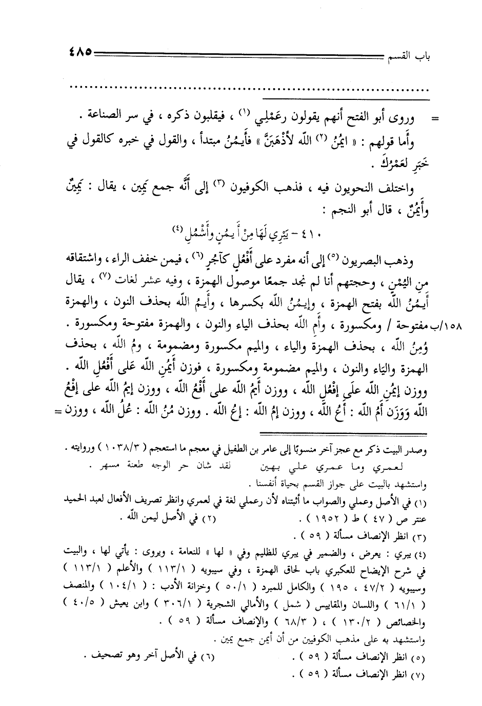وذهب البصريون إلى أنه مفرد على أفعل كآجر, فيمن خفف الراء, واشتقاقه من اليمن, وحجتهم أنا لم نجد جمعًا موصول الهمزة, وفيه عشر لغات,] قال أيمن بفتح الهمزة, وإيمن الله بكسرها, وأيم الله بحذف النون, والهمزة 158/ب مفتوحة / ومكسورة, وأم الله بحذف الياء والنون, والهمزة مفتوحة ومكسورة. ومن الله, بحذف الهمزة والياء, والميم مكسورة ومضمومة, وم الله, بحذف الهمزة والياء والنون, والميم مضمومة ومكسورة, فوزن أيمن الله على أفعل الله. ووزن إيمن الله على إفعل الله, ووزن أيم الله على أفع الله, ووزن إيم الله على إفع الله ووزن أم الله: أع الله, ووزن إم الله: إع الله. ووزن من الله: عل الله, ووزن=