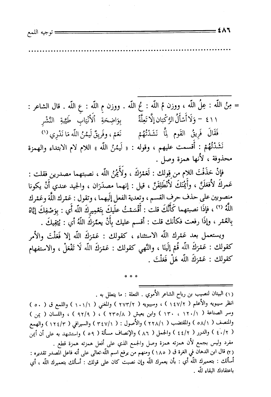 فإن حذفت اللام من قولك: لعمرك, ولأيمن الله, نصبتهما مصدرين فقلت: عمرك لأفعلن, وأيمنك لأنطلقن, قيل: إنهما مصدران, والجيد عندي أن يكونا منصوبين على حذف حرف القسم, وتعدية الفعل إليهما, وتقول: عمرك الله وعمرك الله, فإذا نصبتهما كأنك قلت: أقسمت عليك بتعميرك الله أي: بوصفك إياه بالعمر, وإذا رفعت فكأنك قلت: أقسم عليك بأن يعمرك الله أي: يبقيك.