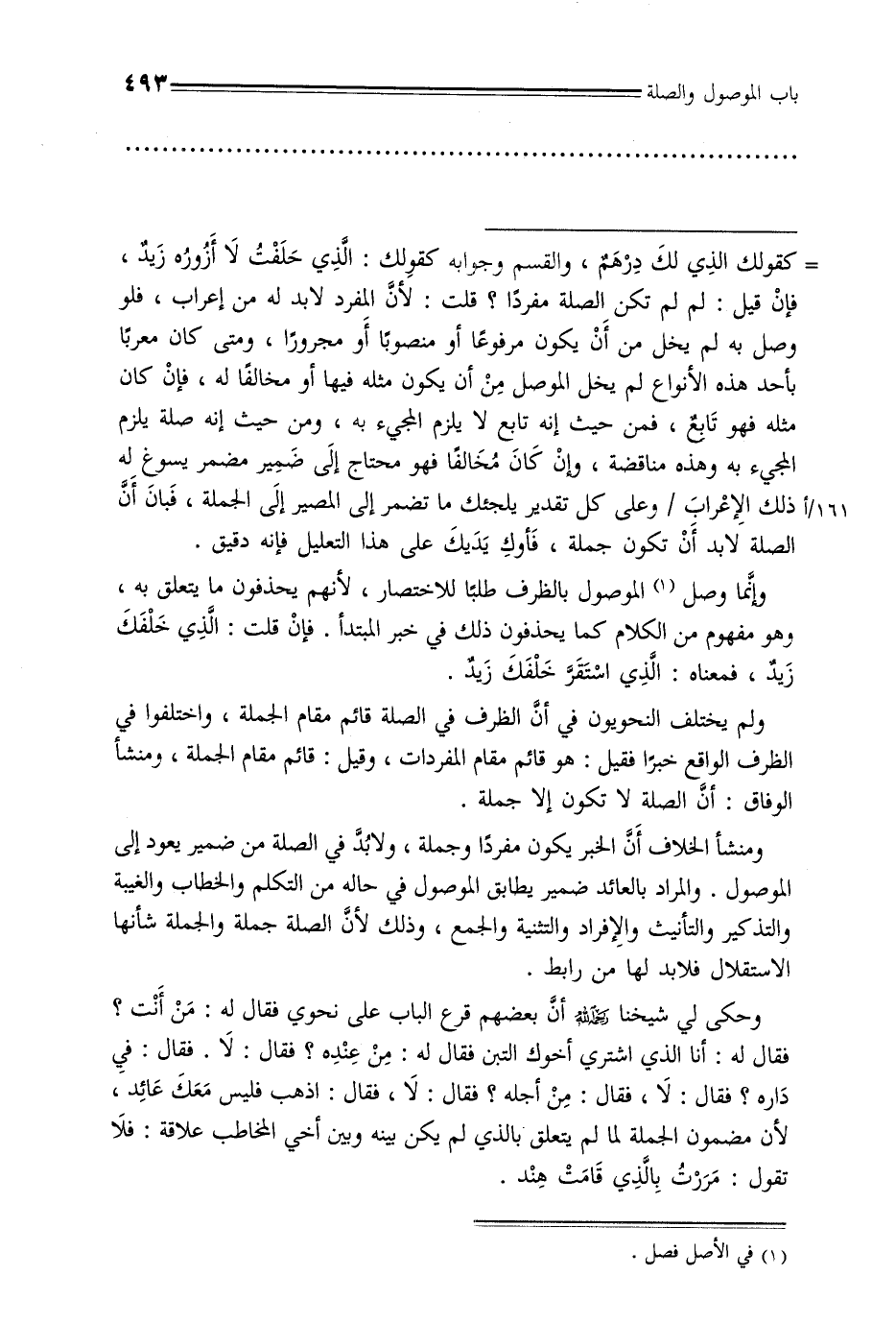 وحكى لي شيخنا رحمه الله أن بعضهم قرع الباب على نحوي فقال له: من أنت؟ فقال له: أنا الذي اشتري أخوك التبن فقال له: من عنده؟ فقال: لا. فقال: في داره؟ فقال: لا, فقال: من أجله؟ فقال: لا, فقال: اذهب فليس معك عائد, لأن مضمون الجملة لما لم يتعلق بالذي لم يكن بينه وبين أخي المخاطب علاقة: فلا تقول: مررت بالذي قامت هند.