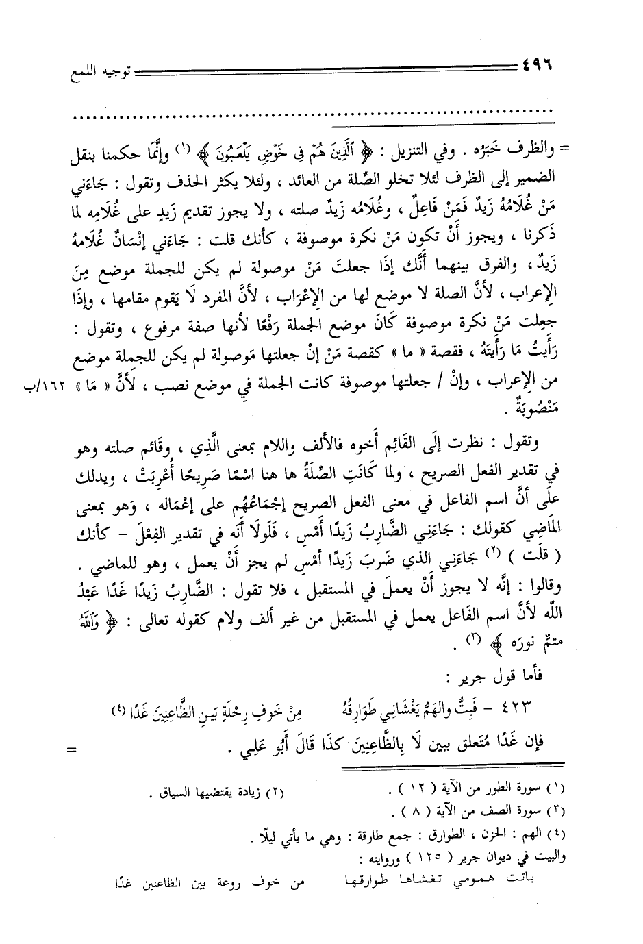 = والظرف خبره. وفي التنزيل: {الذين هم في خوض يلعبون} وإنما حكمنا بنقل الضمير إلى الظرف لئلا تخلو الصلة من العائد, ولئلا يكثر الحذف وتقول: جاءني من غلامه زيد فمن فاعل, وغلامه زيد صلته, ولا يجوز تقديم زيد على غلامه لما ذكرنا, ويجوز أن تكون من نكرة موصوفة, كأنك قلت: جاءني إنسان غلامه زيد, والفرق بينهما أنك إذا جعلت من موصولة لم يكن للجملة موضع من الإعراب, لأن الصلة لا موضع لها من الإعراب, لأن المفرد لا يقم مقامها, وإذا جعلت من نكرة موصوفة كان موضع الجملة رفعًا لأنها صفة مرفوع, وتقول: رأيت ما رأتيه, فقصة «ما» كقصة من إن جعلتها موصولة لم يكن للجملة موضع من الإعراب, وإن/ جعلتها موصوفة كانت الجملة في موضع نصب, لأن «ما» منصوبة.