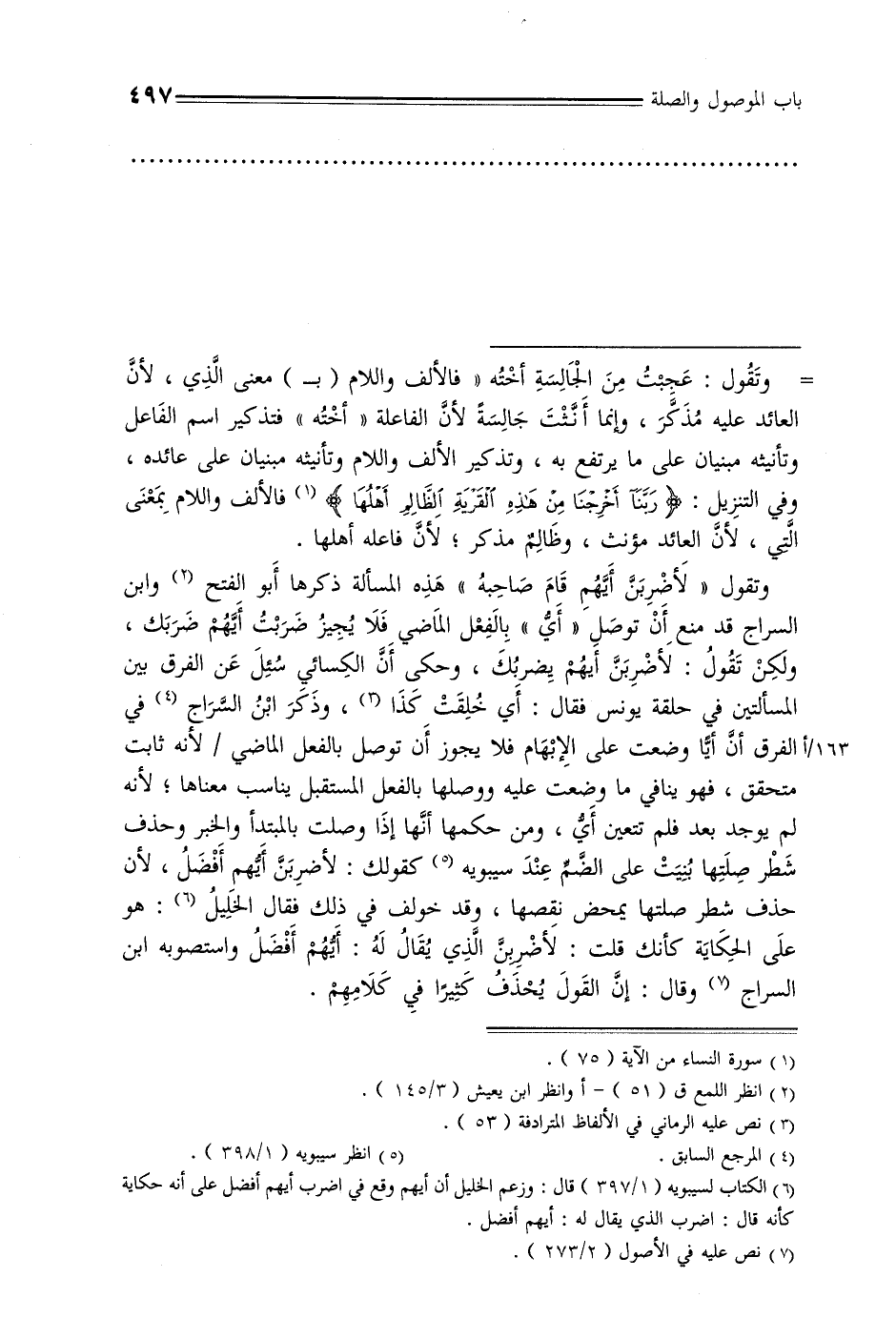 = وتقول: عجبت من الجالسة أخته «فالألف واللام (بـ) معنى الذي, لأن العائد عليه مذكر, وإنما أنثت جالسة لأن الفاعة «أخته» فتذكر اسم الفاعل وتأنيثه مبنيان على ما يرتفع به, وتذكير الألف واللام وتأنيثه مبنيان على عائده, وفي التنزيل: {ربنا أخرجنا من هذه القرية الظالم أهلها} فالألف واللام بمعنى التي, لأن العائد مؤنث, وظالم مذكر, لأن فاعله أهلها.
