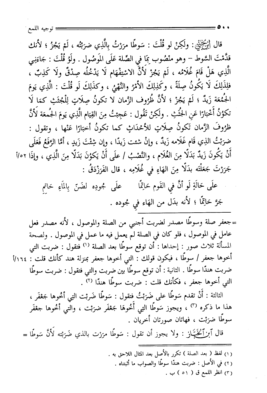قال ابن جني: ولكن لو قلت: سوطًا مررت بالذي ضربته, لم يجز, لأنك قدمت السوط - وهو منصوب بما في الصلة على الموصول. ولو قلت: جاءني الذي هل قام غلامه, لم يجز لأن الاستفهام لا يدخله صدق ولا كذب, فلذلك لا يكون صلة, وكذلك الأمر والنهي, وكذلك لو قلت: الذي يوم الجمعة زيد, لم يجز, لأن ظروف الزمان لا تكون صلات للجثث كما لا تكون أخبارًا عن الجثث. ولكن تقول: عجبت من القيام الذي يوم الجمعة لأن ظروف الزمان تكون صلات للأحداث كما تكون أخبارًا عنها, وتقول: ضربت الذي قام غلامه زيد, وإن شئت زيدًا, وإن شئت زيد, أما الرفع فعلى أن يكون زيد بدلًا من الغلام, والنصب/ على أن يكون بدلًا من الذي, وإذا جررت جعلته بدلًا من الهاء في غلامه, قال الفرزدق: