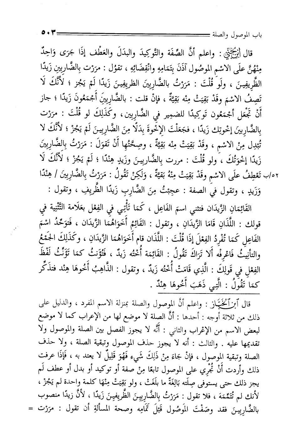 قال ابن جني: واعلم أن الصفة والتوكيد والبدل والعطف إذا جرى واحد منهن على الاسم الموصول آذن بتمامه وانقضائه, تقول: مررت بالضاربين زيدًا الظريفين, ولو قلت: مررت بالضربين الظريفين زيدًا لم يجز, لأنك لا تصف الاسم وقد بقيت منه بقية, فإن قلت: بالضاربين أجمعون زيدًا, جاز أن تجعل أجمعون توكيدًا للضمير في الضاربين, وكذلك لو قلت: مررت بالضاربين إخواتك زيدًا, فجعلت الإخوة بدلًا من الضاربين لم يجز, لأنك لا تبدل من الاسم, وقد بقيت منه بقية, وصحتها أن تقول: مررت بالضاربين زيدًا إخوتك, ولو قلت: مررت بالضاربين وزيد هندًا, لم يجز, لأنك لا تعطف على الاسم وقد بقيت منه بقية, ولكن تقول: مررت بالضاربين/ هندًا وزيد, وتقول في الصفة: عجبت من الضارب زيدًا الظريف, وتقول: القائمان الزيدان فتثني اسم الفاعل, كما تأتي في الفعل بعلامة التثنية في قولك: اللذان قاما الزيدان, وتقول: القائم أخواهما الزيدان, فتوحد اسم الفاعل كما تفرد الفعل إذا قلت: اللذان قام أخواهما الزيدان, وكذلك الجمع والتأنيث فاعرفه ألا تراك تقول: القائمة أخته زيد, فتؤنث كما تؤنث لفظ الفعل في قولك: الذي قامت أخته زيد, وتقول: الذاهب أخوها هند فتذكر كما تقول: التي ذهب أخوها هند.