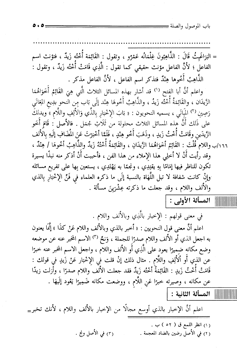 واعلم أن أبا الفتح قد أشار بهذه المسائل الثلاث التي هي القائم أخواهما الزيدان, والقائمة أخته زيد, والذاهب أخوها هند إلى باب من النحو بديع المعاني رصين المباني, يسميه النحويون: «باب الإخبار بالذي والألف واللام» ويدلك على ذلك أن هذه المسائل الثلاث محلولة من ثلاث جمل. فالأصل: قام أخو الزيدين وقامت أخت زيد, وذهب أخو هند, فلما أخبرت عن المضاف إليه بالألف واللام قلت: القائم أخواهما الزيدان, والقائمة أخته زيد والذاهب أخوها/ هند, وقد رأيت أن لا أخلي هذا الإملاء من هذا الفن, فأحببت أن أذكر منه نبدًا يسيرة تكون للناظر فيها إمامًا به يقتدي, ونجمًا به يهتدي, يستعين بها على تفريع مسائله وإن كانت شفافة لا تبل اللهاة بالنسبة إلى ما ذكره العلماء في فن الإخبار بالذي والألف واللام, وقد جعلت ما ذكرته عشرين مسألة.