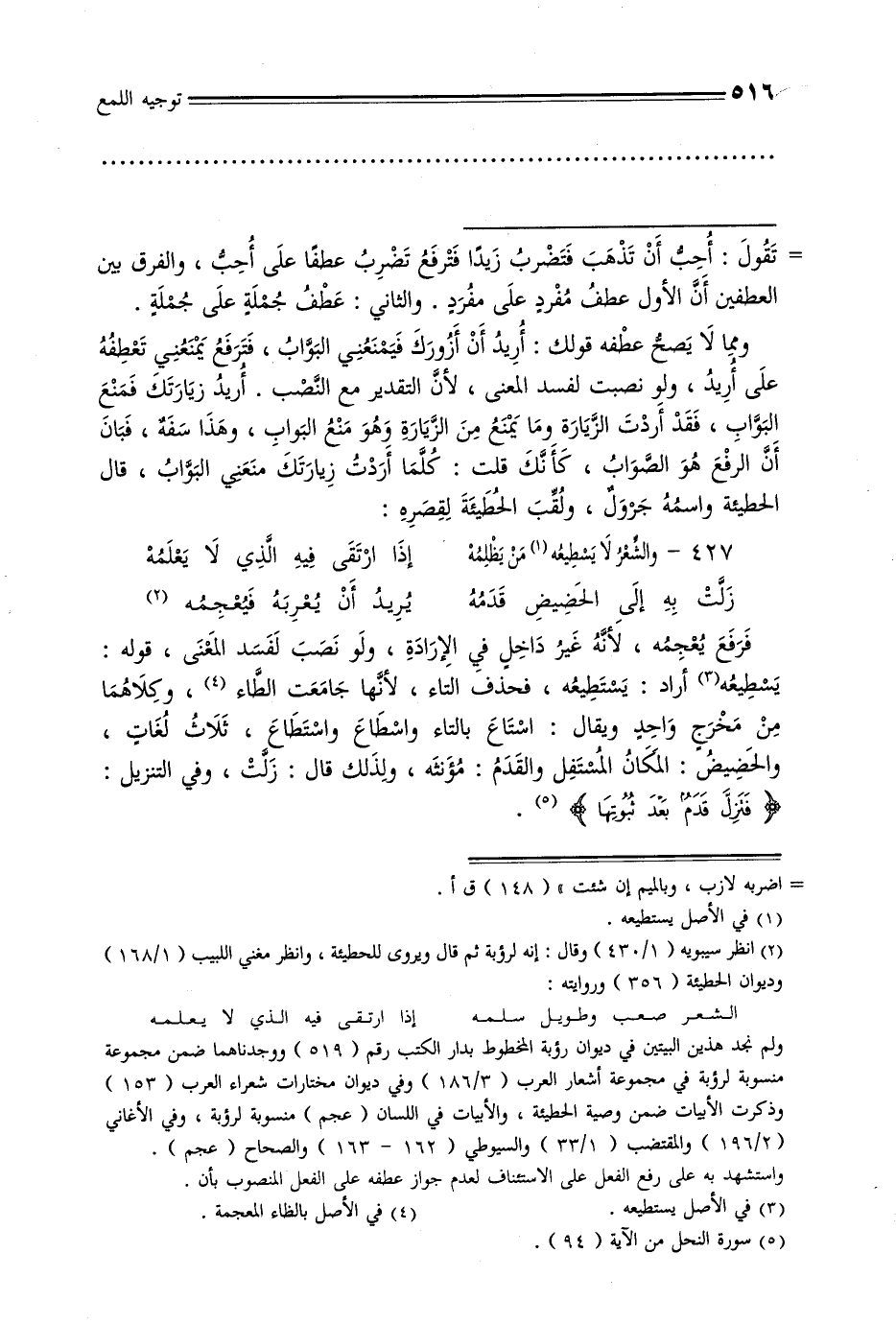= تقول: أحب أن تذهب فتضرب زيدًا فترفع تضرب عطفًا على أحب, والفرق بين العطفين أن الأول عطف مفرد على مفرد. والثاني: عطف جملة على جملة. ومما لا يصح عطفه قولك: أريد أن أزورك فيمنعني البواب, فترفع بمنعني تعطفه على أريد, ولو نصبت لفسد المعنى, لأن التقدير مع النصب. أريد زيارتك فمنع البواب, فقد أردت الزيارة وما يمنع من الزيارة وهو منع البواب, وهذا سفه, فبان أن الرفع هو الصواب, كأنك قلت: كلما أردت زيارتك منعني البواب, قال الحطيئة واسمه جرول, ولقب الحطيئة لقصره: