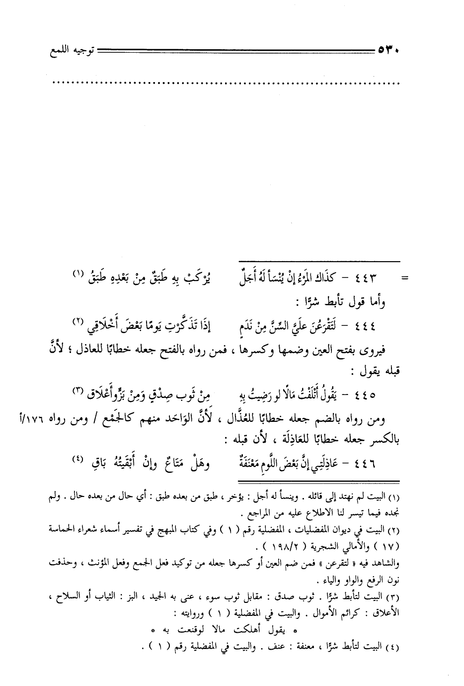 ومن رواه بالضم جعله خطابا للعذال, لأن الواحد منهم كالجمع/ ومن رواه بالكسر جعله خطابًا للعاذلة, لأن قبله: