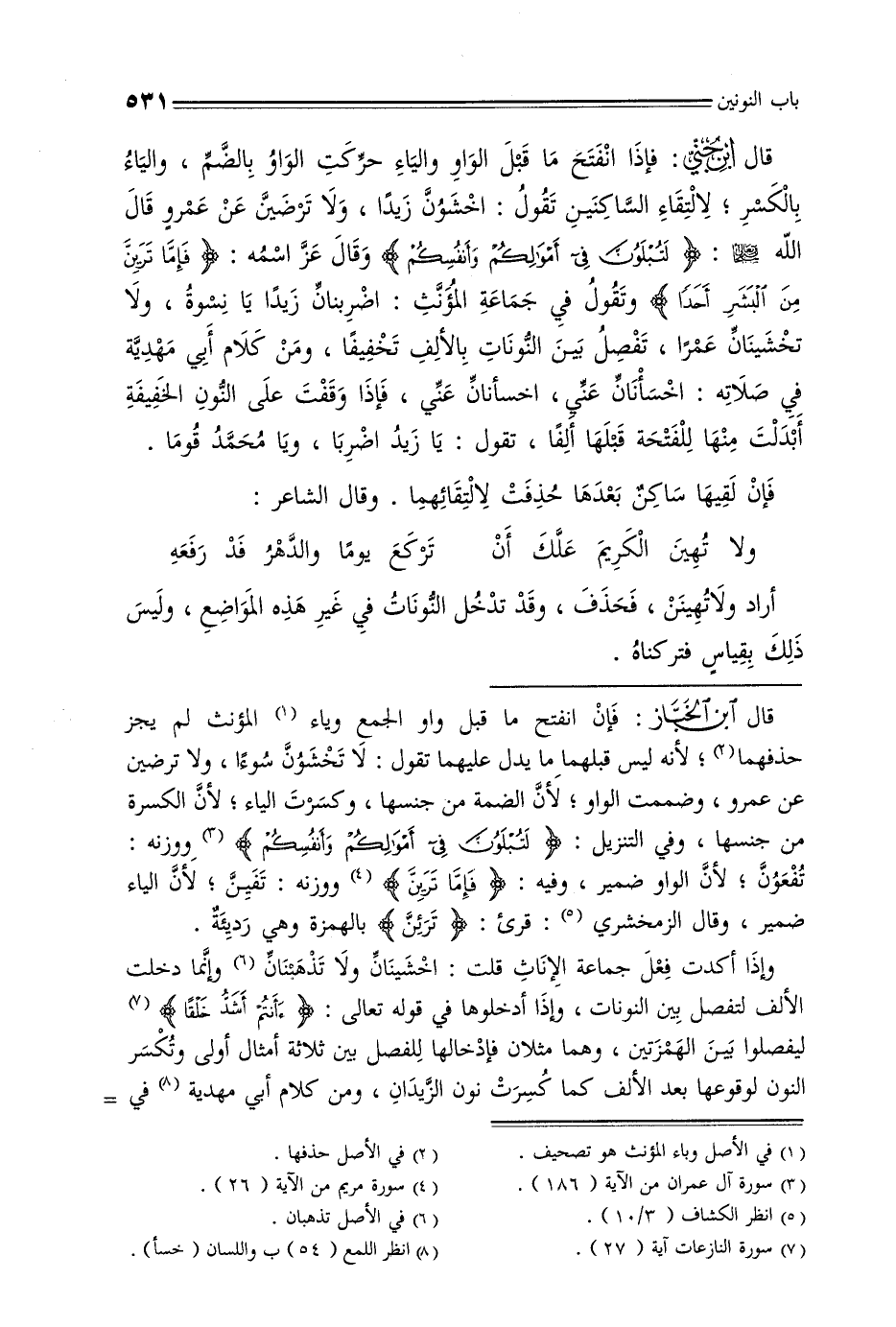 قال ابن جني: فإذا انفتح ما قبل الواو والياء حركت الواو بالضم, والياء بالكسر, لالتقاء الساكنين تقول: احشون زيدًا, ولا ترضين عن عمرو قال الله عز وجل: {لنبلون في أموالكم وأنفكسم} وقال عز اسمه: {فإما ترين من البشر أحدًا} وتقول في جماعة المؤنث: اضربنان زيدًا يا نسوة, ولا تخشينان عمرًا, تفصل بين النونات بالألف تخفيفًا, ومن كلام أبي مهدية في صلاته: اخسأنان عني, اخسأنان عني, فإذا وقعت على النون الخفيفة أبدلت منها للفتحة قبلها ألفًا, تقول: يا زيد اضربا, ويا محمد قوما. فإن لقيها ساكن بعدها حذفت لالتقائهما. وقال الشاعر: