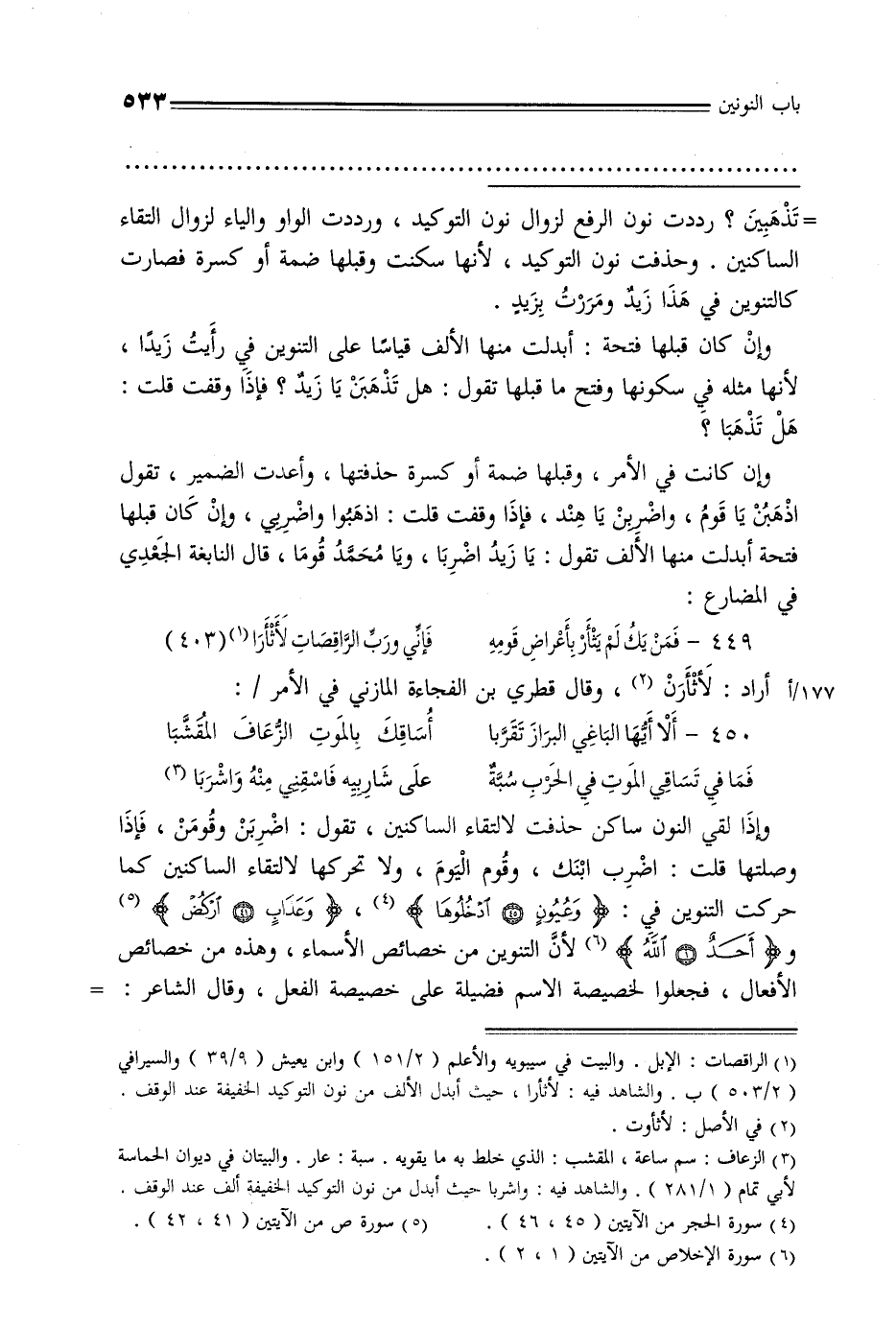وإذا لقي النون ساكن حذفت لالتقاء الساكنين, تقول: اضربن وقومن, فإذا وصلتها قلت: اضرب ابنك, وقوم اليوم, ولا تحركها لالتقاء الساكنين كما حركت التنوين في: {وعيون * ادخلوها} , {وعذاب * اركض} و {أحد * الله} لأن التنوين من خصائص الأسماء, وهذه من خصائص الأفعال, فجعلوا الخصيصة الاسم فضيلة على خصيصة الفعل, وقال الشاعر: