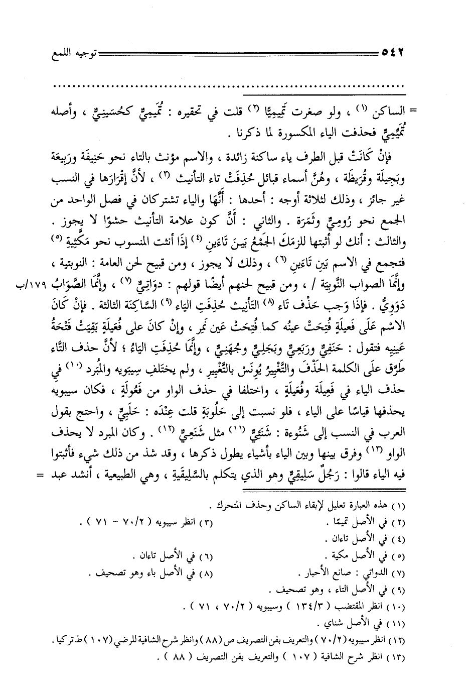 فإن كانت قبل الطرف ياء ساكنة زائدة, والاسم مؤنث بالتاء نحو حنيفة وربيعة وبجيلة وقريظة, وهن أسماء قبائل حذفت تاء التأنيث, لأن إقرارها في النسب غير جائز, وذلك لثلاثة أوجه: أحدها: أنها والياء تشتركان في فصل الواحد من الجمع نحو رومي وثمرة. والثاني: أن كون علامة التأنيث حشورًا لا يجوز. والثالث: أنك لو أثبتها للزمك الجمع بين تاءين إذا أنثت المنسوب نحو مكثية فتجمع في الاسم بين تاءين, وذلك لا يجوز, ومن قبيح لحن العامة: النوبتية, وإنما الصواب النويبة/, ومن قبيح لحنهم أيضًا قولهم: دواني, وإنما الصواب دووي. فإذا وجب حذف تاء التأنيث حذفت الياء الساكنة الثالثة. فإن كان الاسم على فعيلة فتحت عينه كما فتحت عين نمر, وإن كان على فعيلة بقيت فتحة عينيه فتقول: حنفي وربعي وبجلي وجهني, وإنما حذفت الياء, لأن حذف التاء طرق على الكلمة الحذف والتغيير يونس بالتغيير, ولم يختلف سيبويه والمبرد في حذف الياء في فعلية وفعلة, واختلفا في حذف الواو من فعولة, فكان سيبويه يحذفها قياسًا على الياء, فلو نسيت إلى حلوية قلت عنده: حلبي, واحتج بقول العرب في النسب إلى شنوءة: شنئي مثل شنعي. وكان المبرد لا يحذف الواو وفرق بينها وبين الياء بشياء يطول ذكرها, وقد شذ من ذلك شيء فأثتبوا فيه الياء قالوا: رجل سليقي وهو الذي يتكلم بالسليقية, وهي الطبيعة, أنشد عبد
