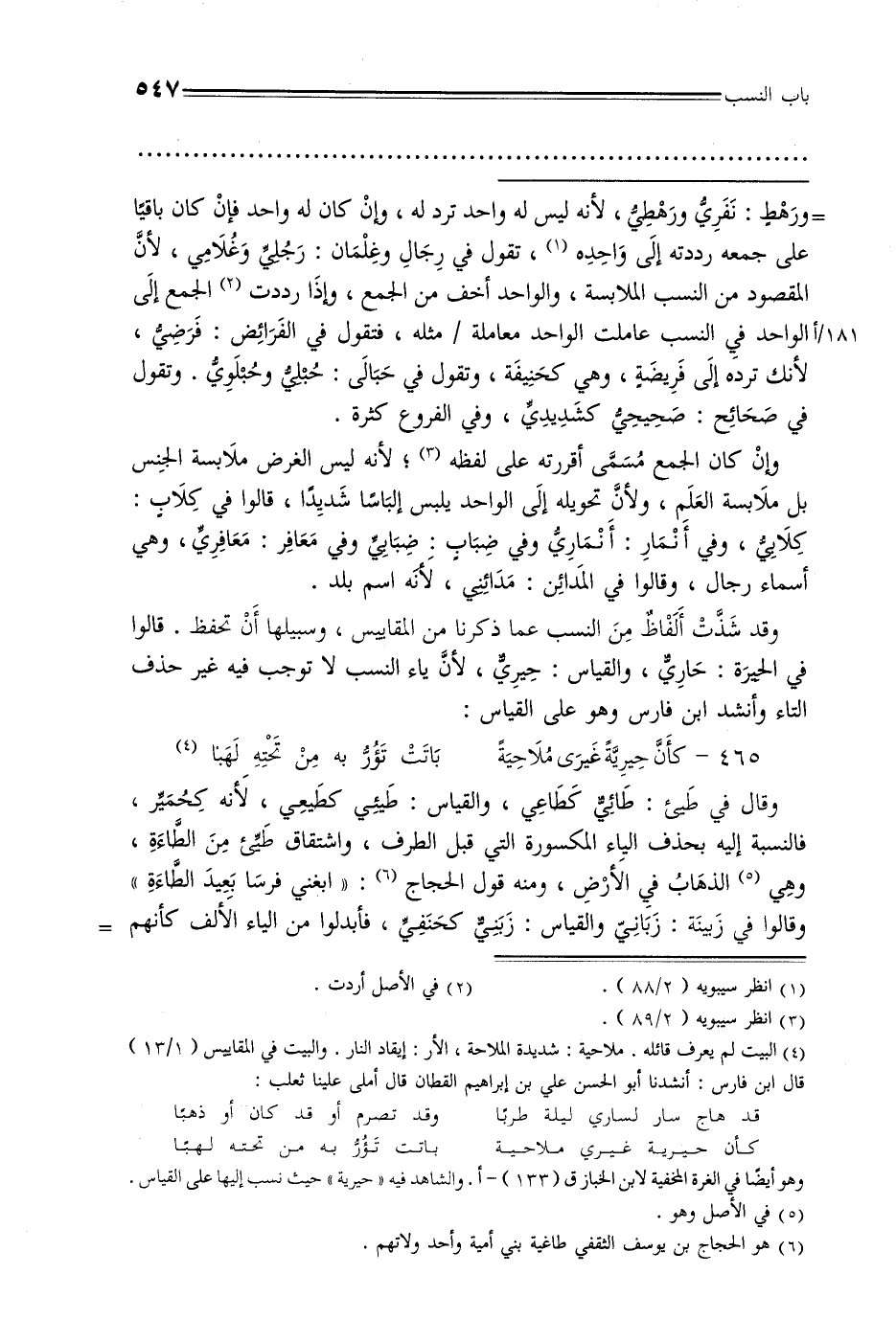 وقد شذت ألفاظ من النسب عما ذكرنا من المقاييس, وسبيلها أن تحفظ. قالوا في الحيرة: حاري, والقياس: حيري, لأن ياء النسب لا توجب فيه غير حذف التاء وأنشد ابن فارس وهو على القياس:
