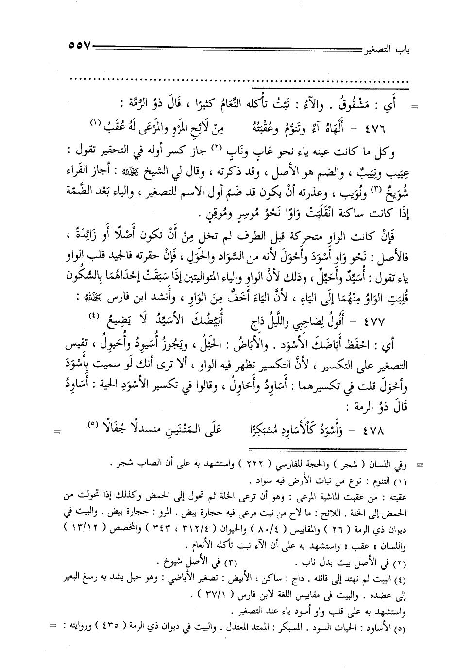 أي: احفظ أباضك الأسود. والأباض: الحبل, ويجوز أسيود وأحيول, تقيس التصغير على التكسير, لأن التكسير تظهر فيه الواو, ألا ترى أنك لو سميت بأسود وأحول قلت في تكسيرهما: أساود وأحاول, وقالوا في تكسير الأسود الحية: أساود قال ذو الرمة:
