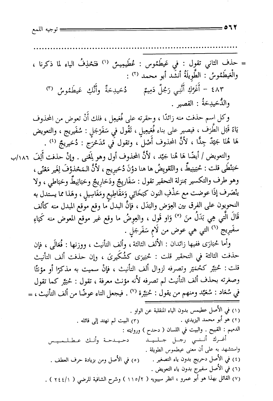 وكل اسم حذفت منه زائدًا, وحقرته على قعيعل, فلك أن تعوض من المحذوف ياء قبل الطرف, فيصير على بناء فعيعيل, تقول في سفرجل: سفيريج, والتعويض ها هنا جيد جدًا, لأن المحذوف أصل, وتقول في مدحرج: دحيريج.