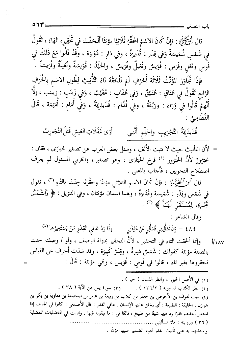 قال ابن الخباز: فإن كان الاسم الثلاثي مؤنثًا وحقرته جئت بالتاء, تقول في شمس وقدر: شميسة وقديرة, وهما اسمان مؤنثان, وفي التنزيل: {والشمس تجري لمستقر لها}.