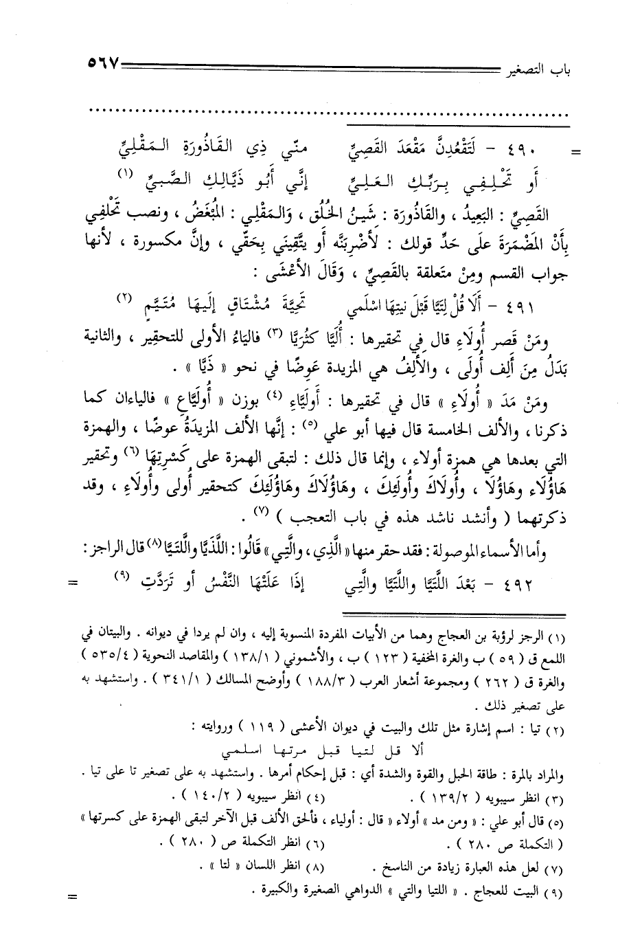 ومن مد «أولاء» قال في تحقيرها: أولياء بوزن «أولياع» فالياءان كما ذكرنا, والألف الخامسة قال فيها أبو علي: إنها الألف المزيدة عوضًا, والهمزة التي بعدها هي همزة اولاء, وإنما قال ذلك: لتبقى الهمزة على كسرتها وتحقير هاؤلاء وهاؤلا, وأولاك وأولئك, وهاؤلاك وهاؤلئك كتحقير أولى وأولاء, وقد ذكرتهما (وأنشد ناشد هذه في باب التعجب).