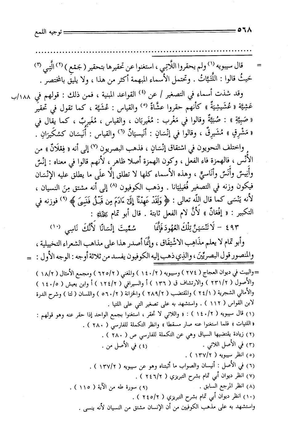 وقد شذت أسماء في التصغير/ عن القواعد المبنية, فمن ذلك: قولهم في عشية «عشيشية» كأنهم حقروا عشاة والقياس: عشية, كما تقول في تحقير «صبية»: صبية وقالوا في مغرب: مغيربان, والقياس, مغيرب, كما يقال في «مشرق» مشيرق, وقالوا في إنسان: أنيسيان والقياس: أنيسان كسكيران. واختلف النحويون في اشتقاق إنسان, فذهب البصريون إلى أنه «فعلان» من الأنس, فالهمزة فاء الفعل, وكون الهمزة أصلا ظاهر, لأنهم قالوا في معناه: إنس وأنيس وأنس وأناسي, وهذه الأسماء كلها لا تطلق إلا على ما يطلق عليه الإنسان فيكون وزنه في التصغير فعيليانا. وذهب الكوفيون إلى أنه مشتق من النسيان, لأنه ينسى كما قال الله تعالى: {ولقد عهدنا إلى آدم من قبل فنسى} فوزنه في التكبير: «إفعان» لأن لام الفعل ثابتة. قال أبو تمام رحمه الله:
