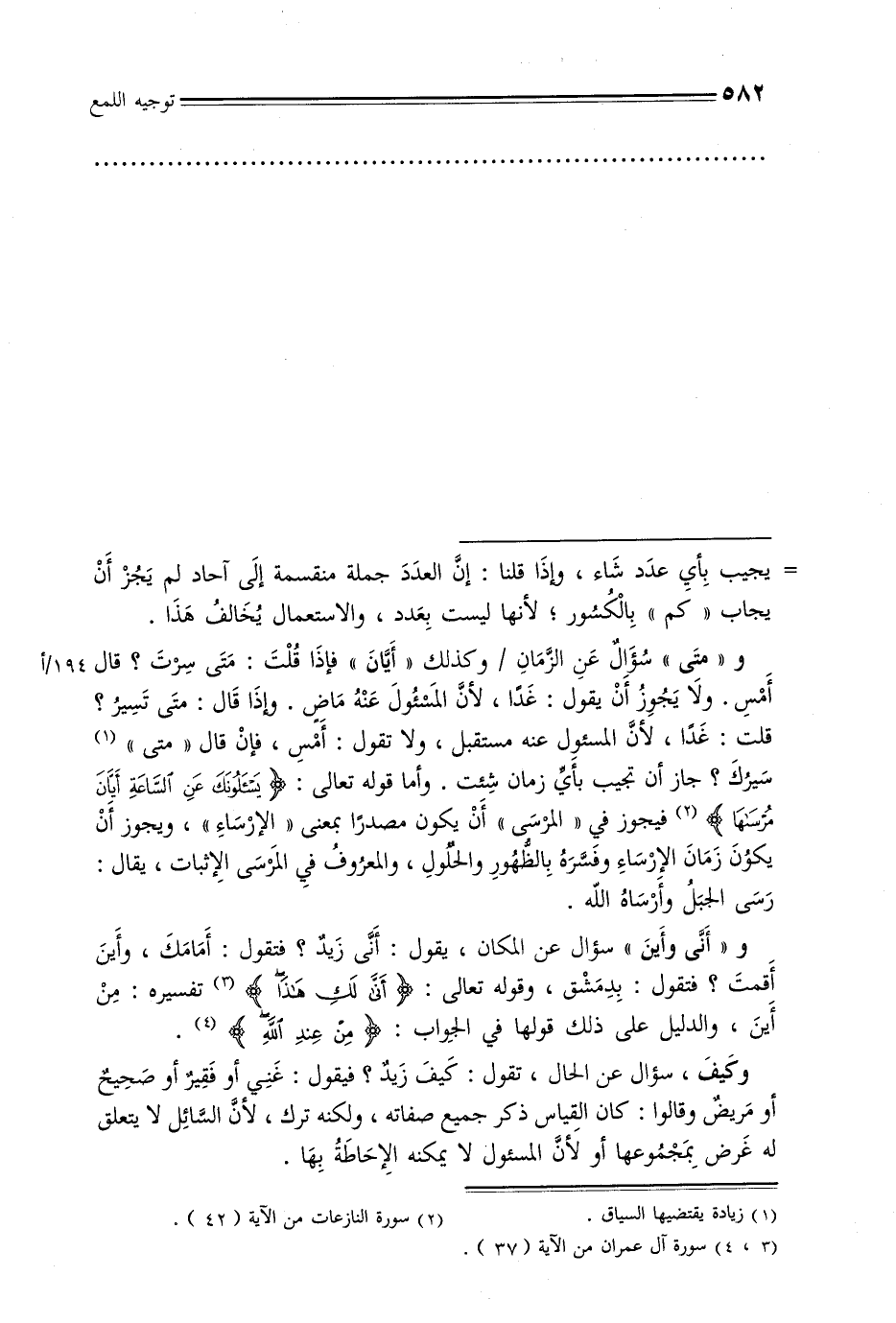 و«متى» سؤال عن الزمان/ وكذلك «أيان» فإذا قلت: متى سرت؟ قال أمس. ولا يجوز أن يقول: غدًا, لأن المسئول عنه ماض. وإذا قال: متى تسير؟ قلت: غدًا, لأن المسئول عنه مستقبل, ولا تقول: أمس, فإن قال «متى» سيرك؟ جاز أن تجيب بأي زمان شئت. وأما قوله تعالى: {يسألونك عن الساعة أيان مرساها} فيجوز في «المرسى» أن يكون مصدرًا بمعنى «الإرساء» , ويجوز أن يكون زمان الإرساء وفسره بالظهور والحلول, والمعروف في المرسى الإثبات, يقال: رسى الجبل وأرساه الله.